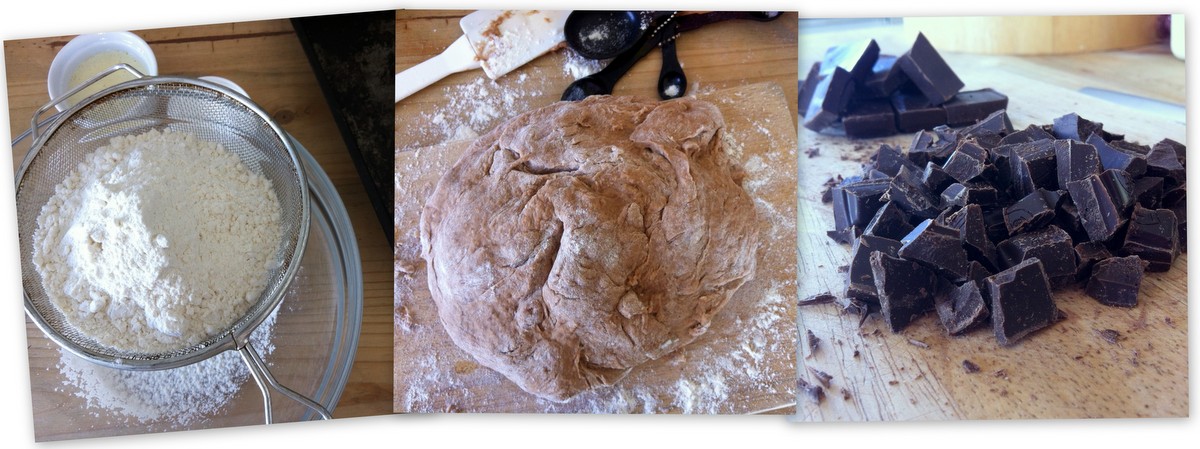 5.) Tip the mixture onto a lightly floured surface. Knead for 10 minutes until the dough is soft and springy. If the dough is too sticky dust it lightly with some extra flour. Knead in the chocolate chunks.