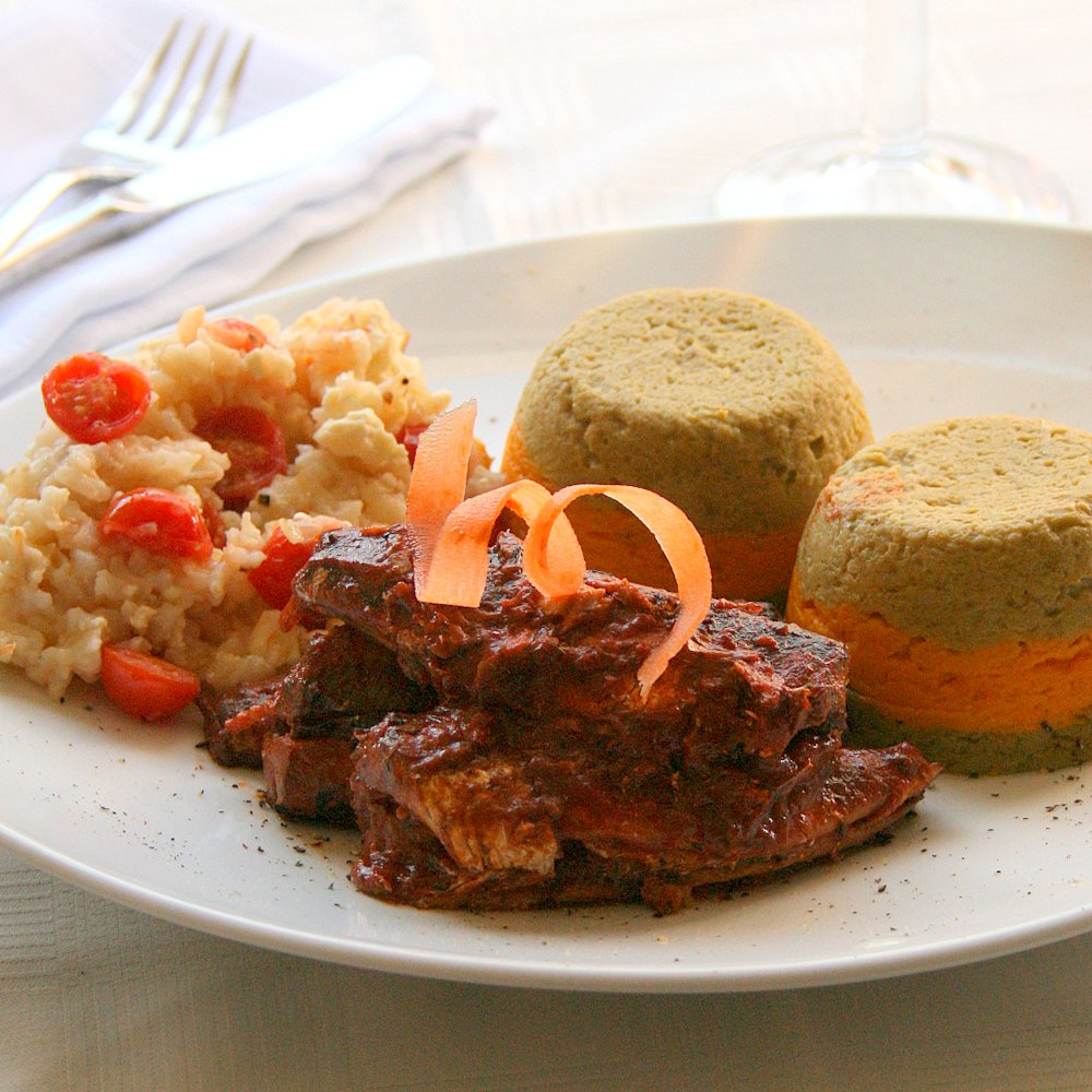 Step 12.) To serve: invert a dariole mould onto a plate. Give the plate a good shake, carefully lift the mould and the timbale should come out easily.