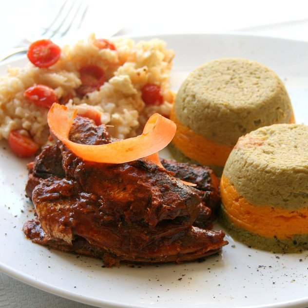 PAN FRIED PILCHARDS WITH VEGGIE TIMBALES & BROWN RICE SALAD