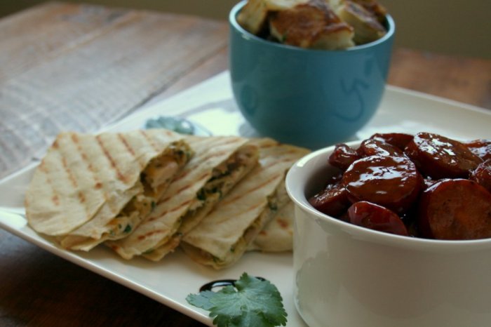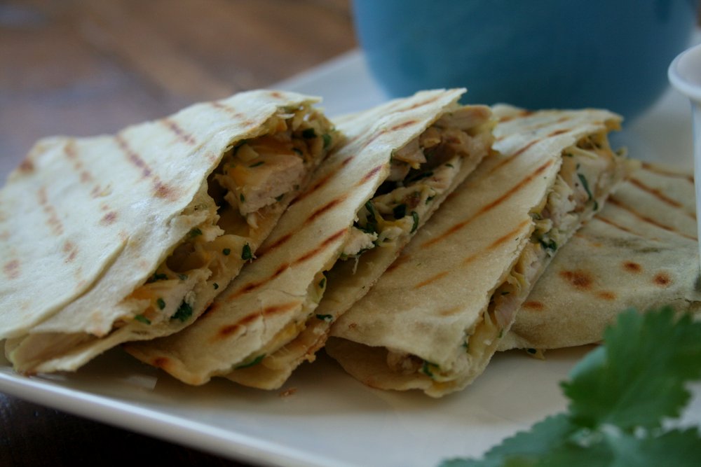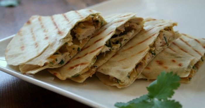 5.) Heat a griddle pan over a medium heat. Place a tortilla in the pan and spread a quarter of the chicken mixture over the top. Place another tortilla on top. Cook for a minute until the cheese starts to melt. Carefully flip over and cook for another minute or until all the cheese has melted. Remove from the pan. Repeat with the remaining tortillas and filling.