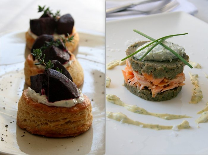 Given that we had to prepare two “fine dining” dishes using the ingredients I finally decided on a starter of puff pastry tartlets with a herby cottage cheese filling topped with caramelised beetroot. The other dish, the main course, was a stack of delicious lentil mash and flaked smoked salmon trout, topped with herby cucumber cottage cheese and served with a rich butter sauce. I included lots of herbs and spices in the dishes (I particularly love the combination of cinnamon and beetroot in the tartlets) for extra flavour and flair.