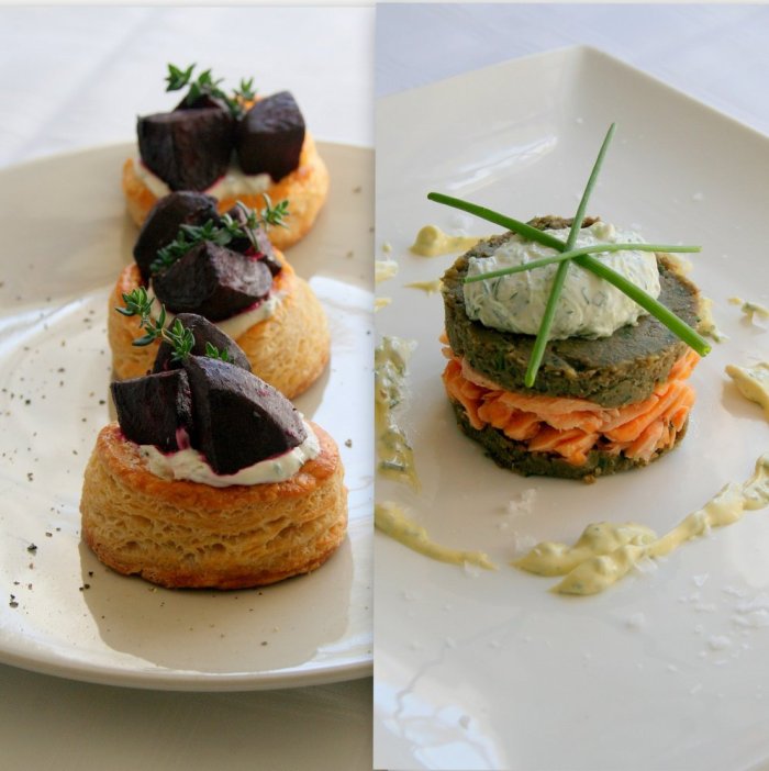 CARAMELISED BEETROOT TARTLETS / SALMON TROUT AND LENTIL STACKS