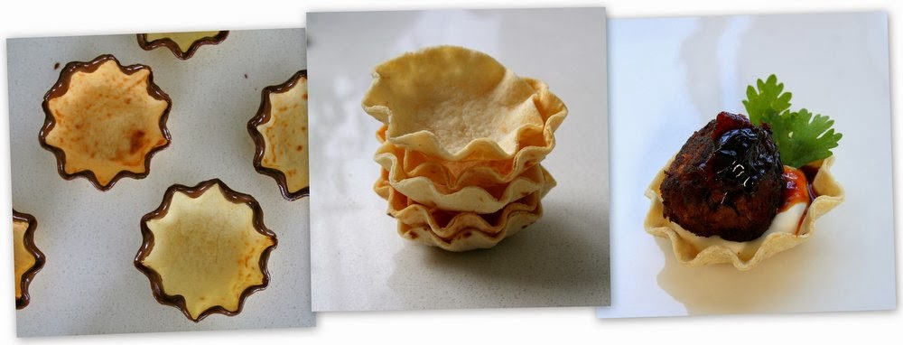 3.) Pop the meatballs on some kitchen towel. Next, fill each canapé shell with a teaspoon of sour cream and pop one meatball into each. Top with about ½ to 1 teaspoon of tomato chilli jam, sprinkle with coriander leaves and serve immediately.