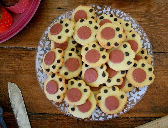 Cook’s note – this biscuit dough is extremely versatile. I also decorated small paw shaped cookies with chocolate chips and fondant icing for the party. In the past I have also flavoured the dough with a teaspoon of cinnamon. You can drizzle them with ordinary glacé icing or simply bake and enjoy as is with a dusting of icing sugar to serve. All of these ideas work well!