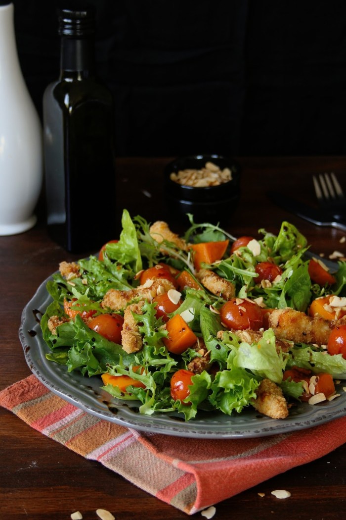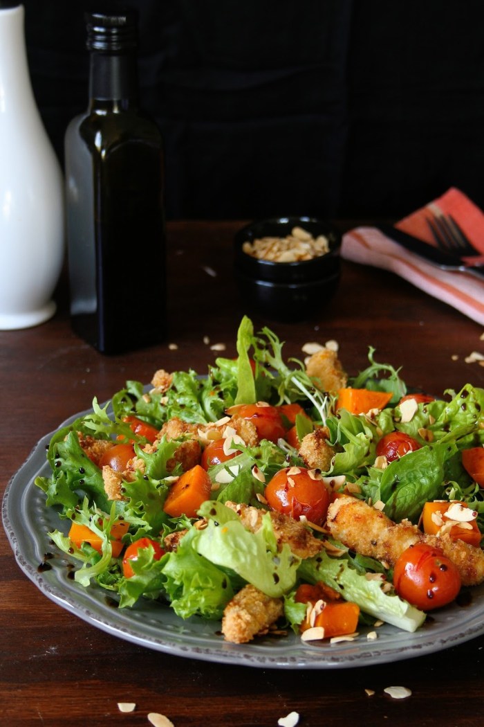 6.) To assemble the salad: arrange the mixed leaves on a large platter. Arrange the goujons, roasted butternut and tomatoes on top. Sprinkle with toasted almonds and drizzle with balsamic vinegar, or your favourite dressing.