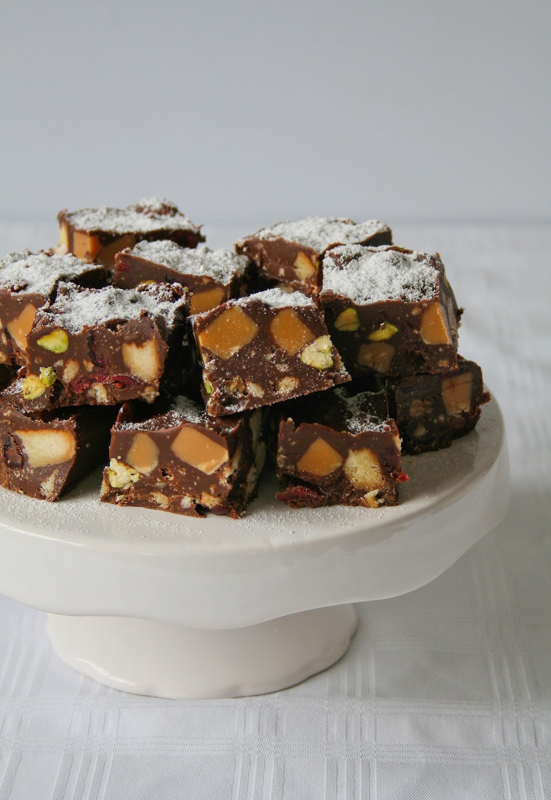 This festive rocky road recipe is a firm favourite on my edible gift list and in this version I have ditched the usual digestive biscuits and marshmallows in favour of some delicious and appropriately Christmassy-hued treats. This is a no bake recipe and the ingredients make it rich, extravagant and rather special. As I write this I have just popped another two batches into the fridge to be packaged up for the chocoholics in my life. (Never mind your friends and family, I am sure Santa would not mind a block or two of this under the tree this year!)