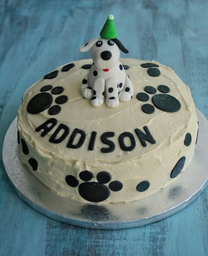 Also on the subject of birthday cake, here is a snap of a spotty dog cake I made for a friend’s daughter last weekend. It was a simple vanilla cake iced with vanilla buttercream and decorated with black fondant paw prints and spots. I loved putting this together, even the fondant doggie on top. All I can say is thank goodness for Pinterest and YouTube tutorials!