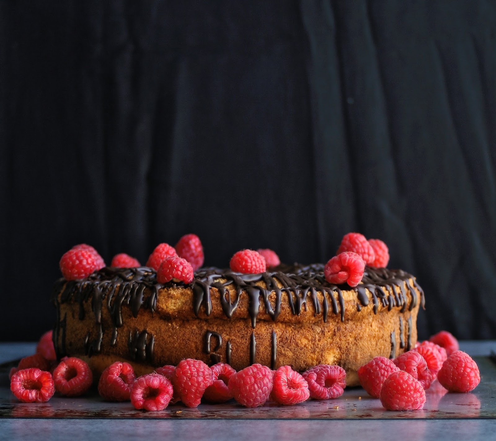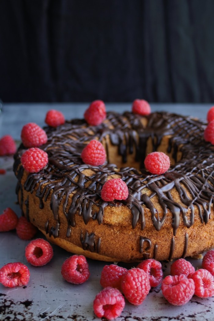 5.) Optional decoration: Melt the carob chunks and drizzle over the cooled cake. Decorate with fresh raspberries just before serving.