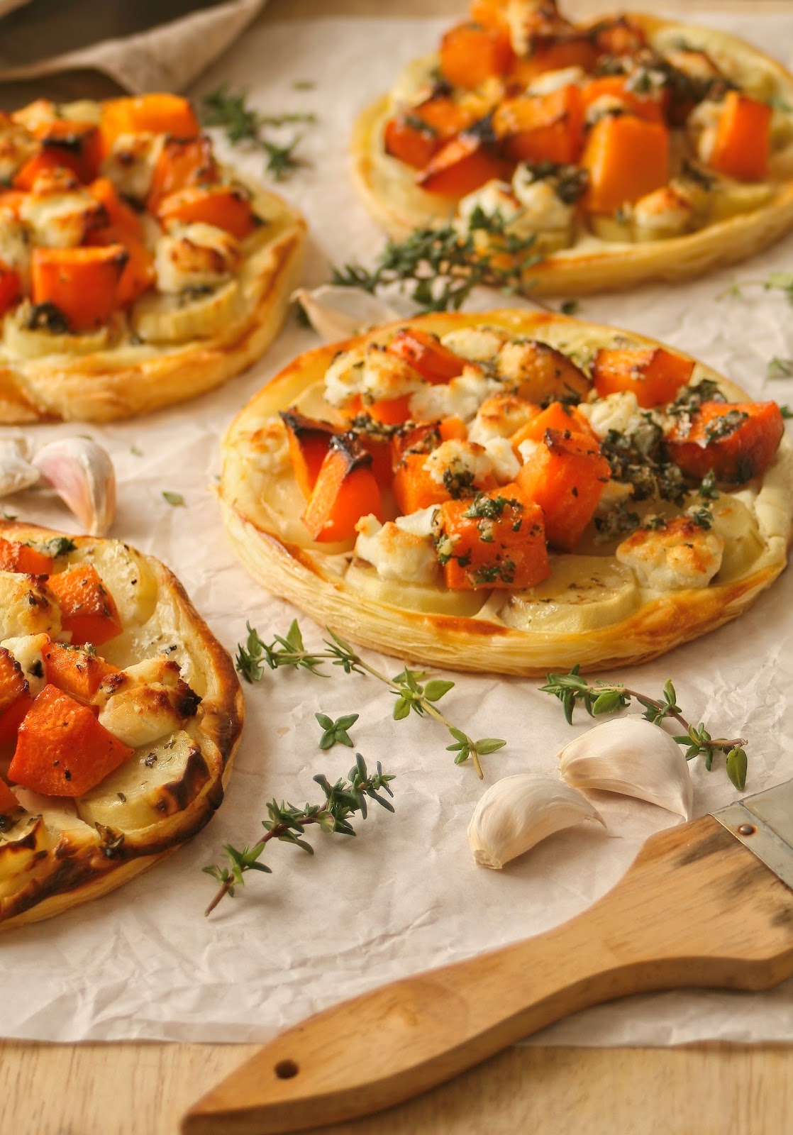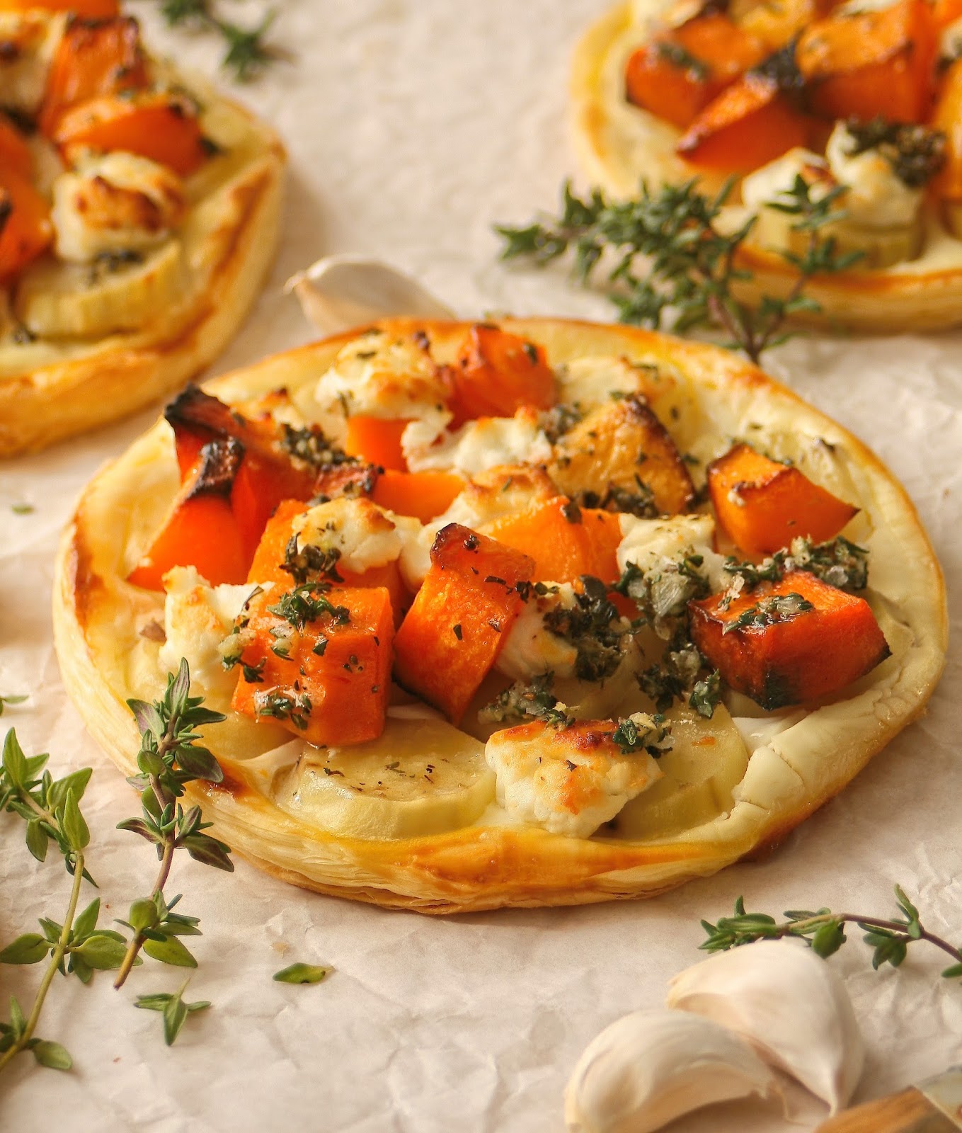 Since I do not have any pastry loving Peruvian bears at home to make it for me, I tend to keep a pack of puff pastry in the freezer. Open tarts make an easy and delicious supper option for week days. I usually make something along the lines of a pesto, chicken and mushroom type of combo but also like to try new flavours every now and then. This veggie version is adapted from an Ottolenghi recipe for sweet potato galettes. I added some butternut cubes and a delicious thyme oil for extra flavour.