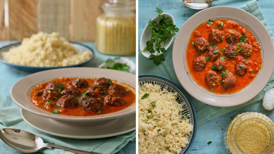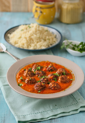 5.) Arrange the meatballs in a single layer in an ovenproof dish. Pour the sauce over the top. Cover the dish with a lid or some foil and cook in the oven for 30 minutes. Remove the lid and cook the meatballs for a further 10 minutes. Serve with couscous or pasta.