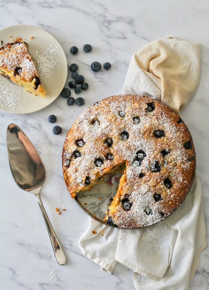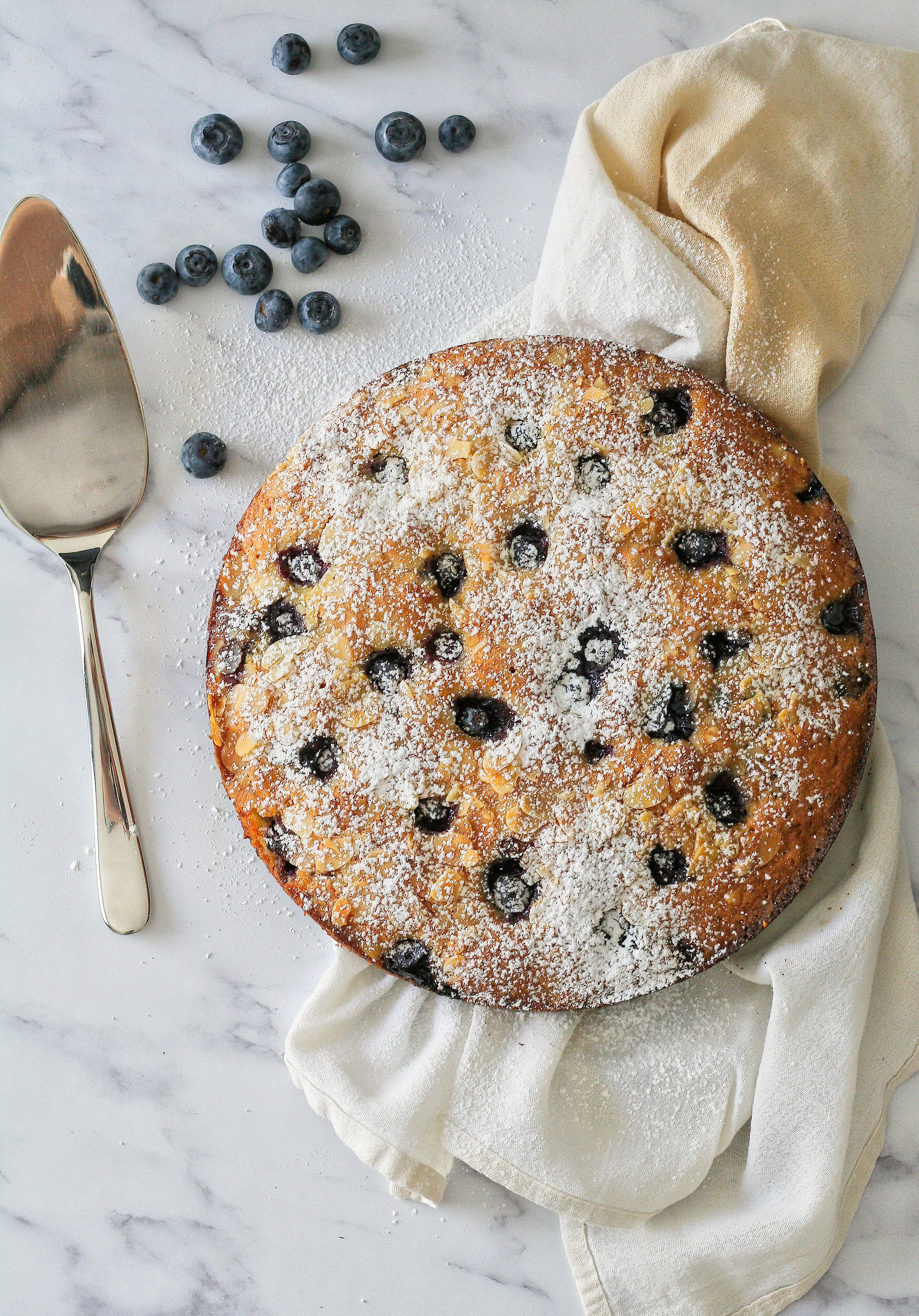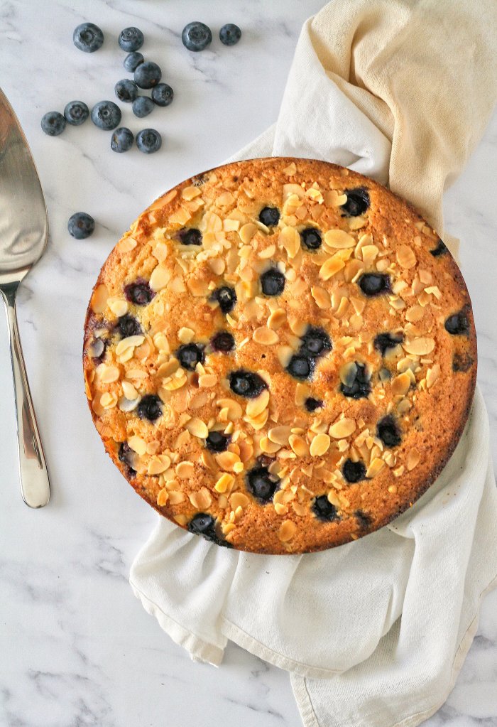 4.) Pour the mixture into the prepared cake tin. Sprinkle the remaining blueberries and flaked almonds on top. Bake the cake for 50 minutes or until an inserted skewer comes out clean. Allow the cake to cool for 30 minutes before removing from the tin. Dust with icing sugar and serve warm or cooled.