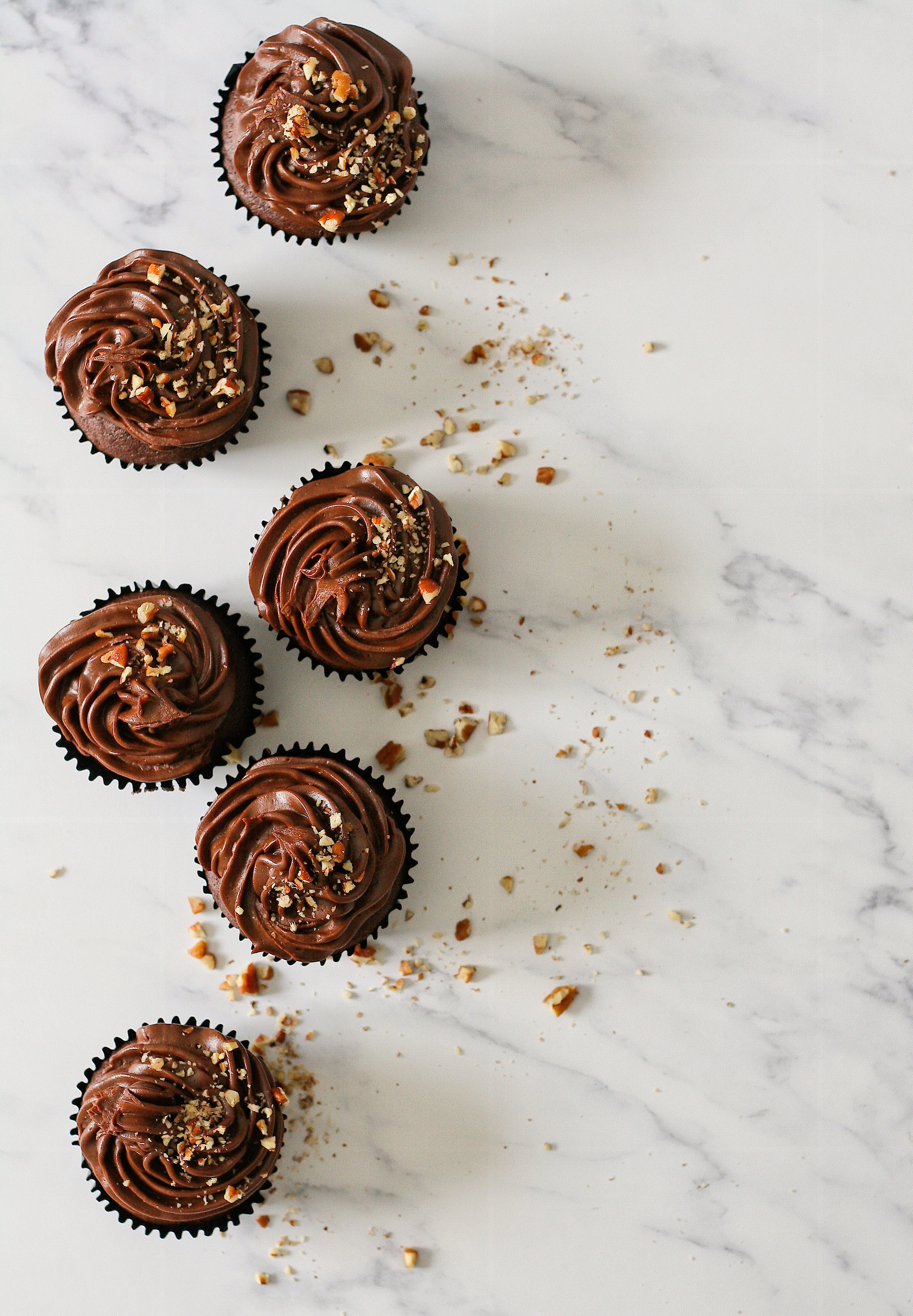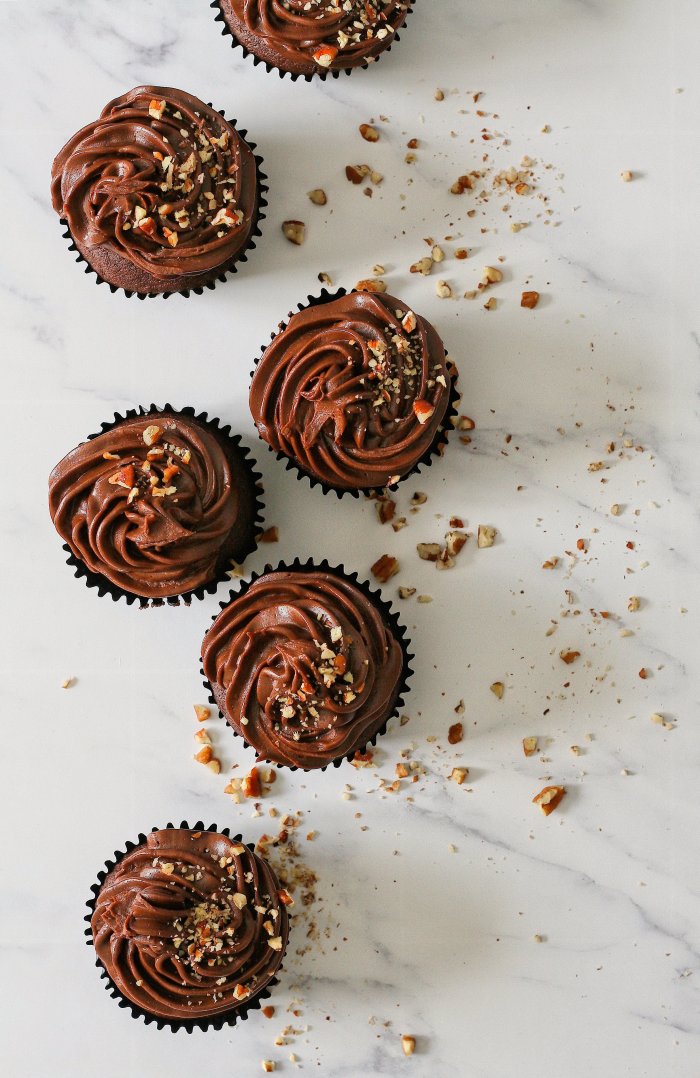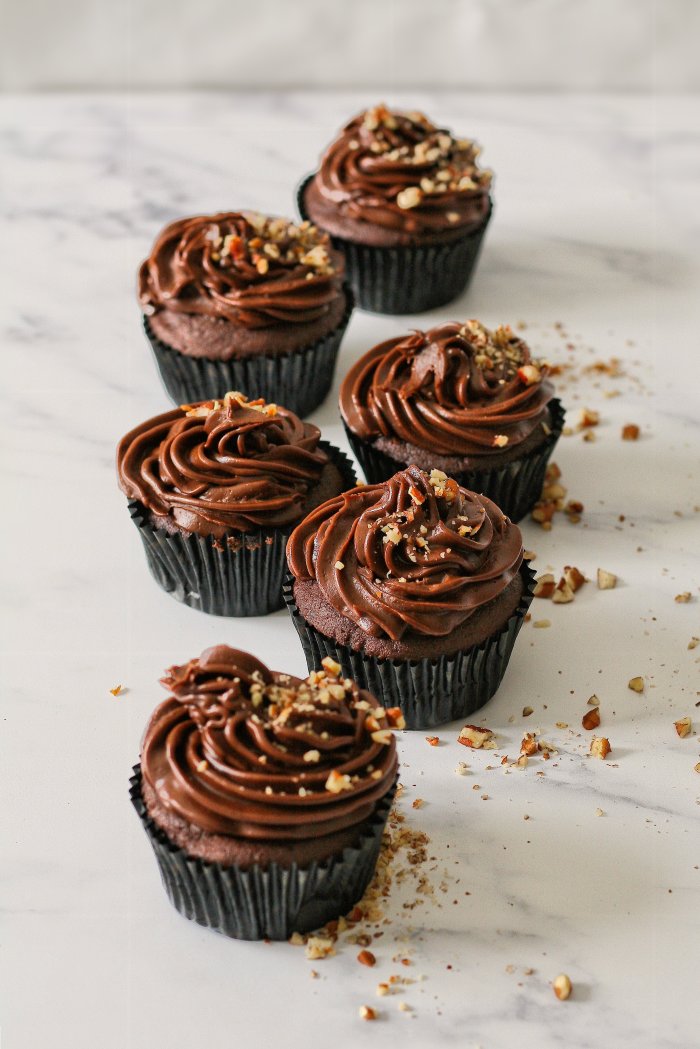 7.) Pipe the ganache onto the cupcakes and decorate with chopped nuts.