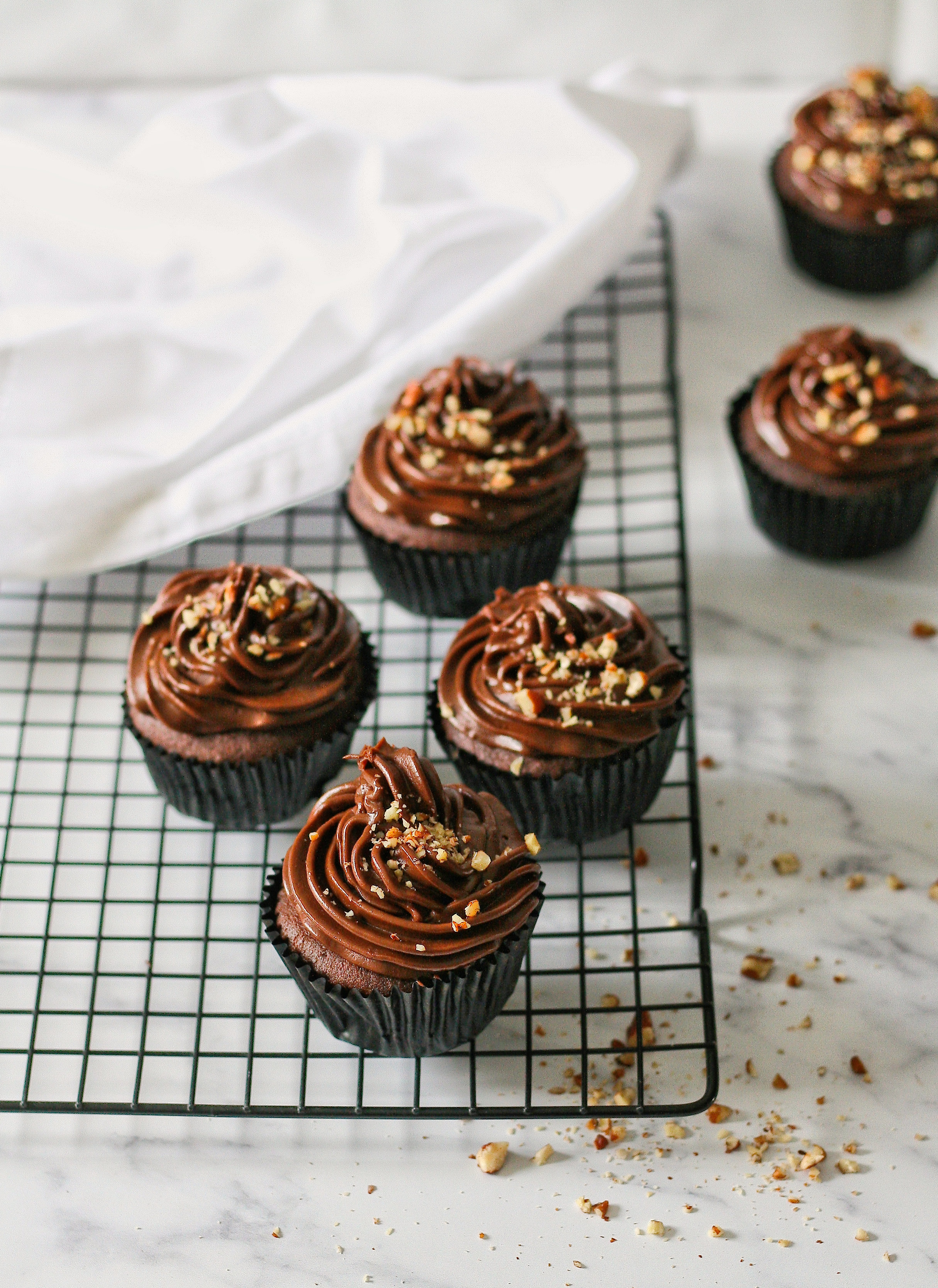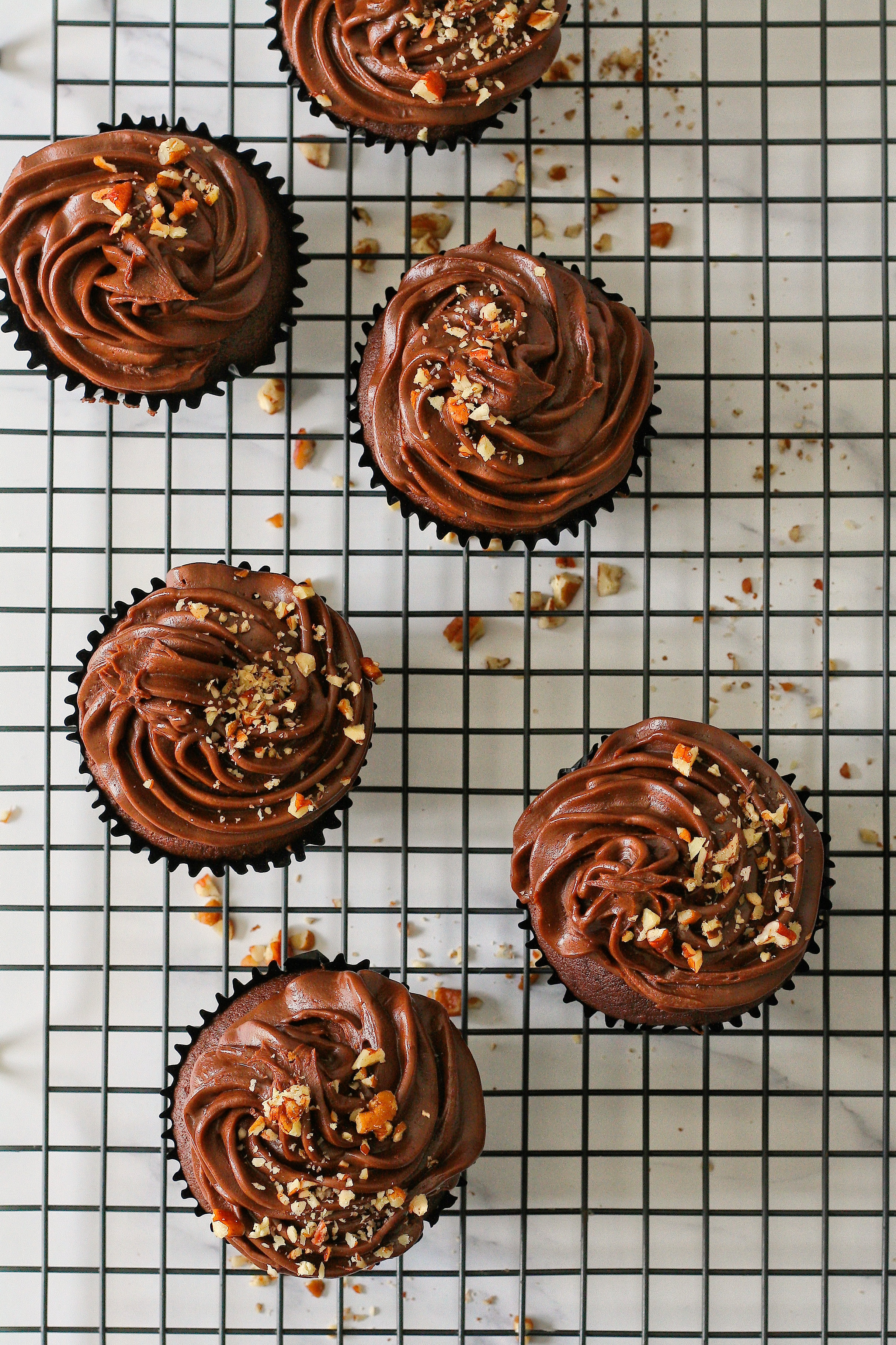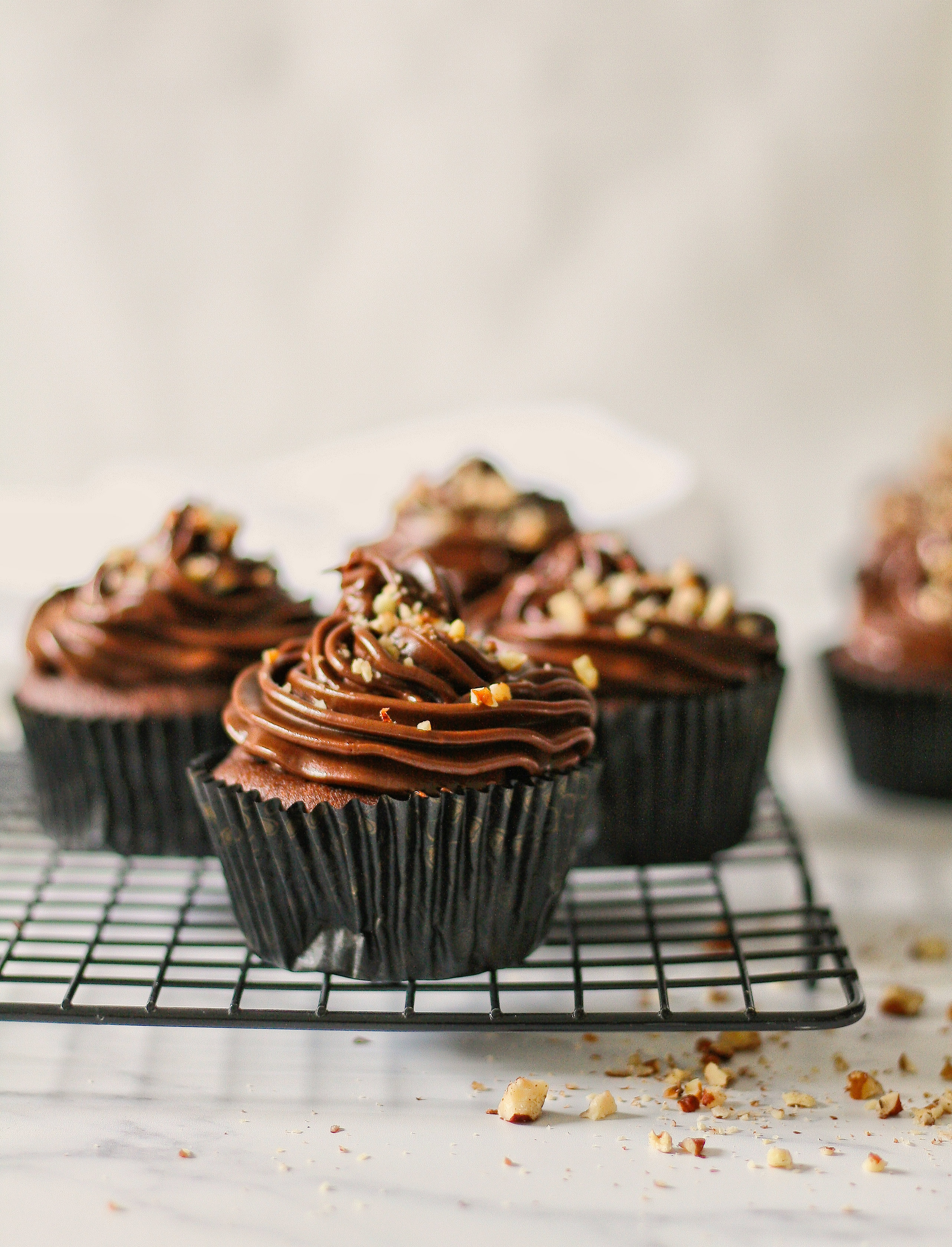 7.) Pipe the ganache onto the cupcakes and decorate with chopped nuts.