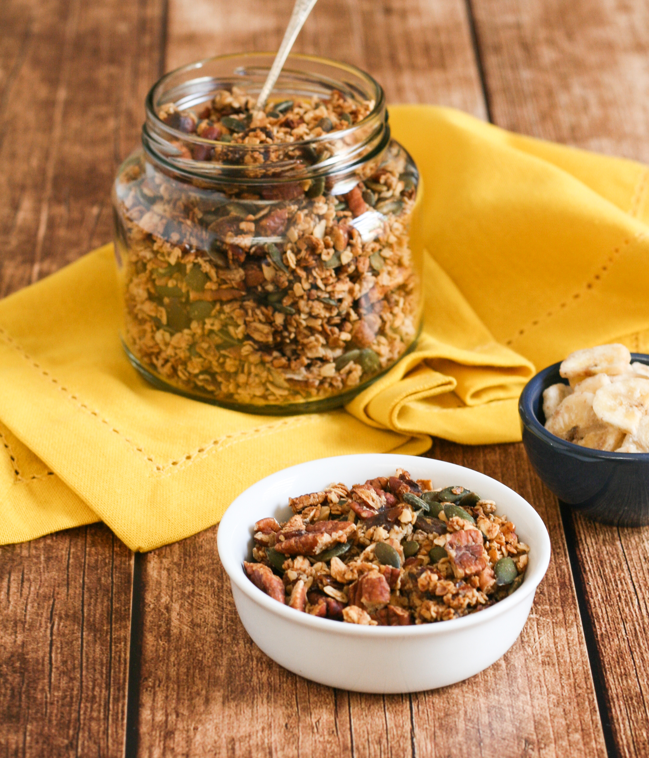 Granola is an absolute cupboard and breakfast staple around here, and I love trying out different ingredients and making each batch a little different. Dates are a fabulous addition to homemade granola – after half an hour in the oven they’ll be chewy and caramelly, yum! There are the usual nuts and seeds included here (use whichever ones you like but pecans and pumpkin seeds are particularly good in this recipe) and I’ve added a good helping of coconut flakes to the mix too. Breakfast is served!