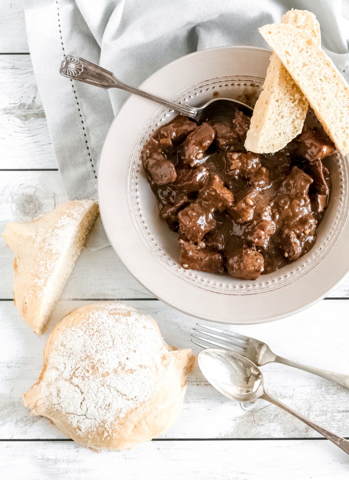 7.) Add the beef back into the pan. Add the Worcestershire sauce, wine, beef stock and yoghurt. Stir well, then simmer gently for 15 minutes until the sauce has thickened. (If the sauce gets too thick add a splash of water or stock to thin it out.) Season with salt and pepper. Dish onto plates and serve with fresh rolls.