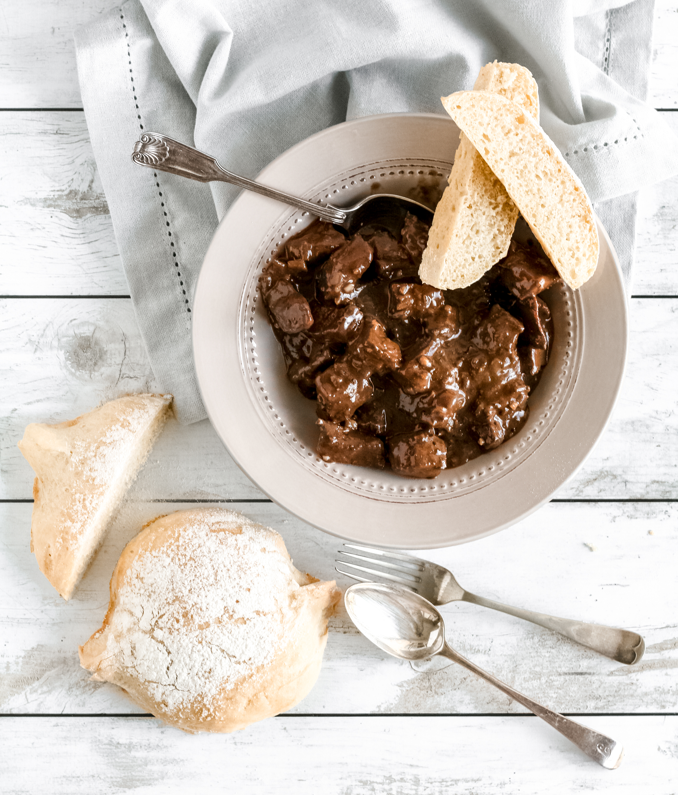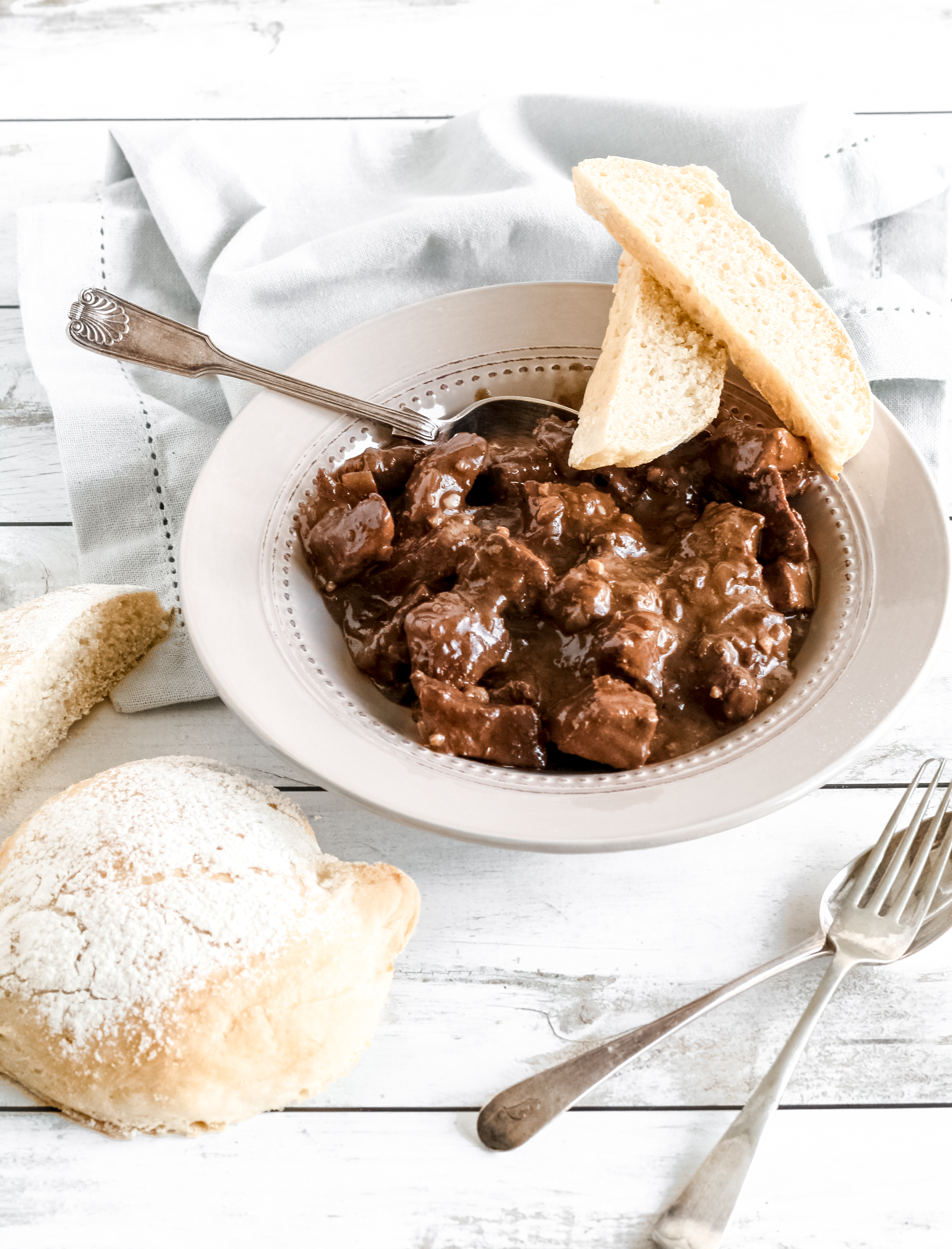 7.) Add the beef back into the pan. Add the Worcestershire sauce, wine, beef stock and yoghurt. Stir well, then simmer gently for 15 minutes until the sauce has thickened. (If the sauce gets too thick add a splash of water or stock to thin it out.) Season with salt and pepper. Dish onto plates and serve with fresh rolls.
