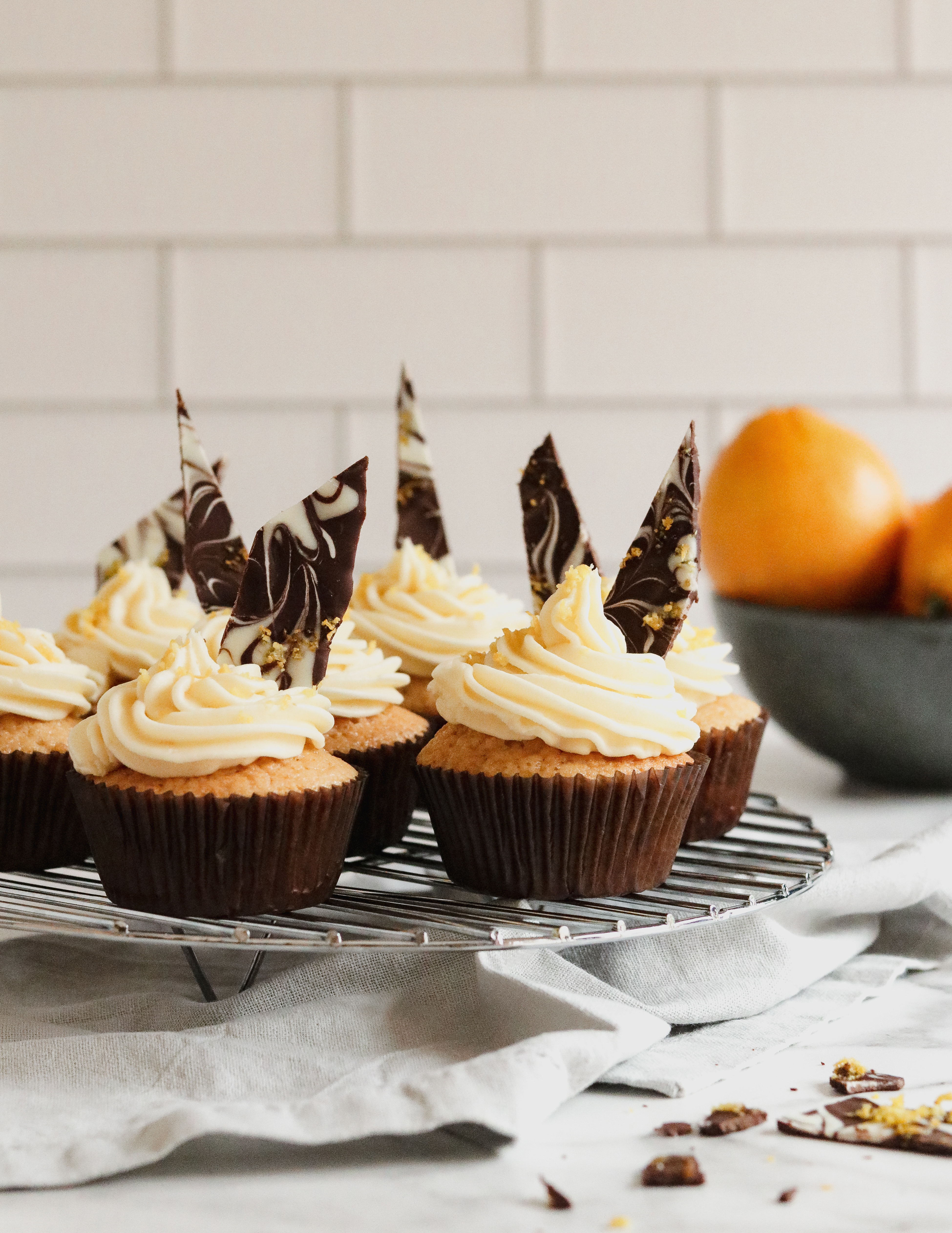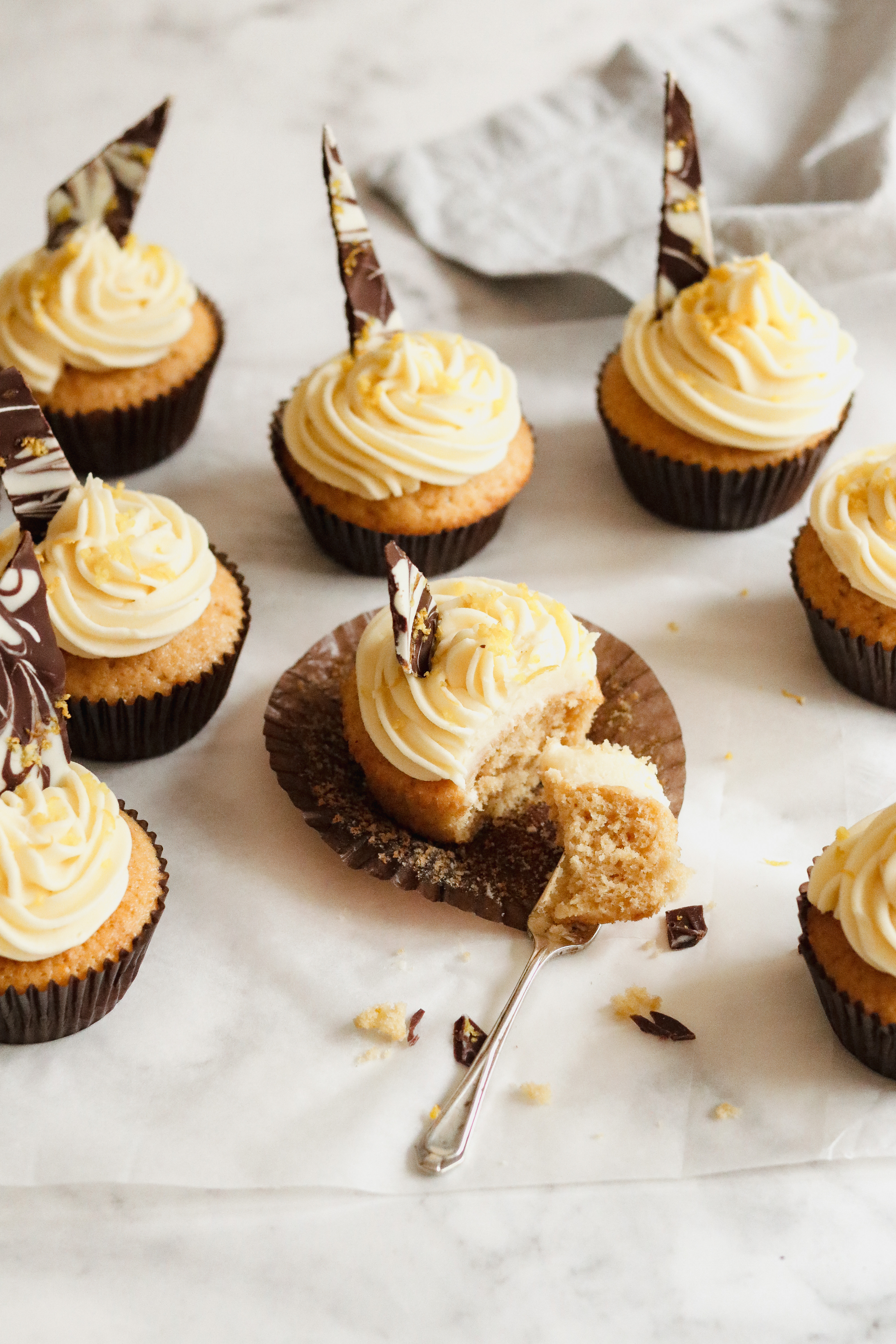 7.) Spread or pipe the icing over the cold cupcakes. Optional: decorate with orange zest or chocolate bark.
