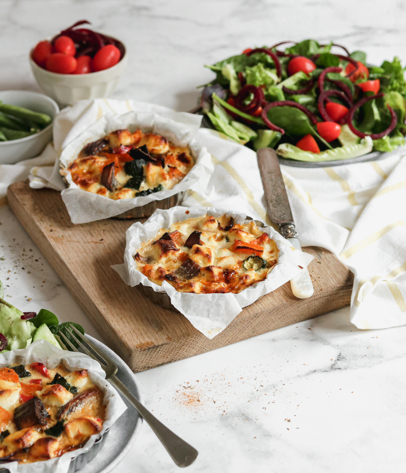 3.) Divide the roasted vegetables between the tins. Cut or break the cheese into small chunks and dot these over the vegetables.