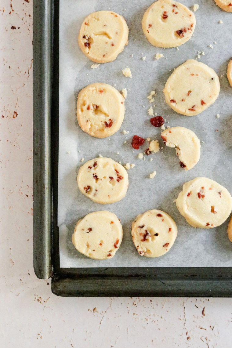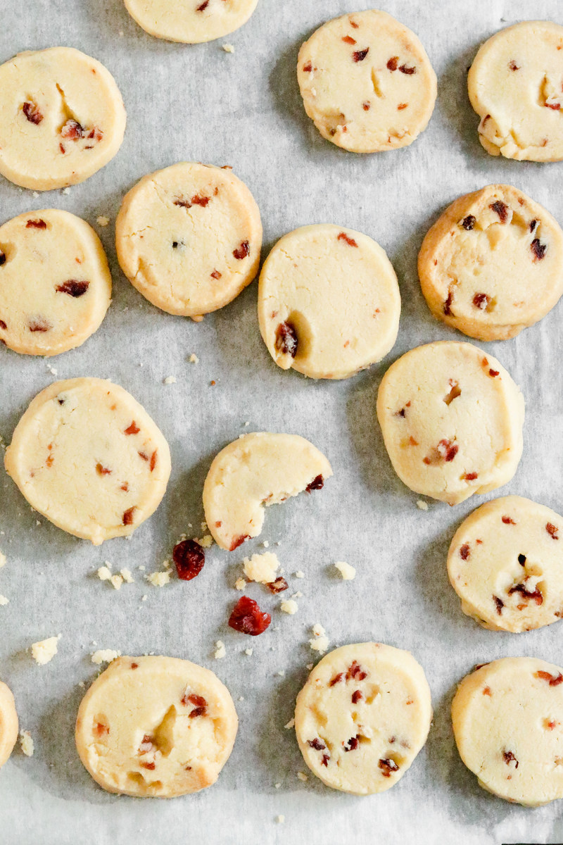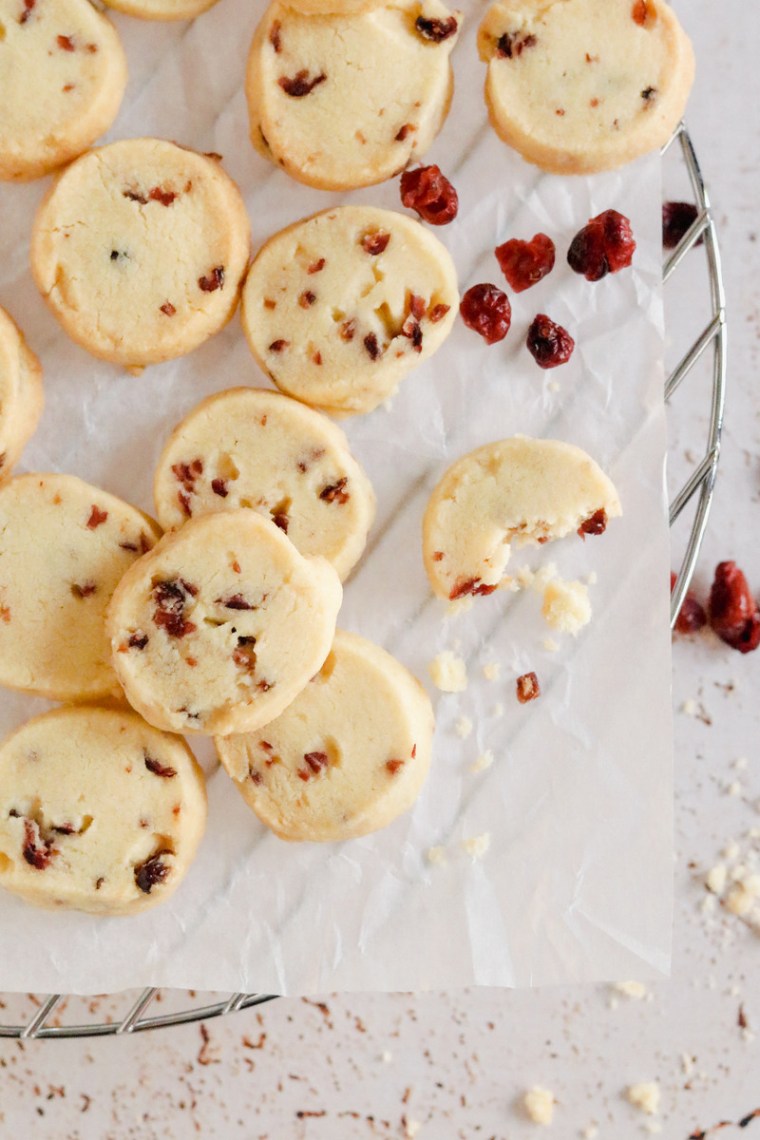 I usually make these as plain shortbread cookies (they are simply sublime with a cup of tea), but in this version I decided to add dried cranberries and they were fabulous. You could absolutely play around with this recipe and add chopped nuts, chocolate or spices instead – have fun with it! You can also dust the cookies with some icing sugar before serving if you wish.