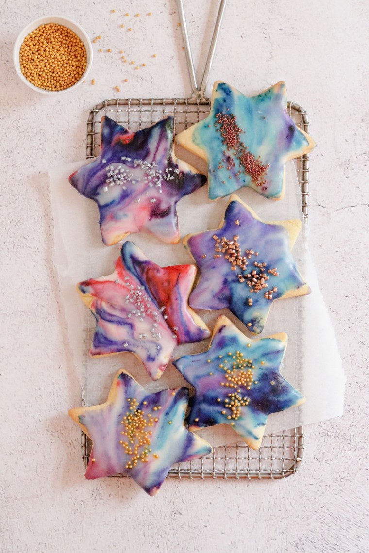I went for a “galaxy” theme and used purple, turquoise, blue and pink gel colouring for the icing. If you’re using this technique you can choose any colours to match the occasion you’re baking for. Usually when it comes to baking uniformity is one of the things we aim for, but what I rather love about these is that no two cookies will look exactly the same and each will be as unique as the people who enjoy them.