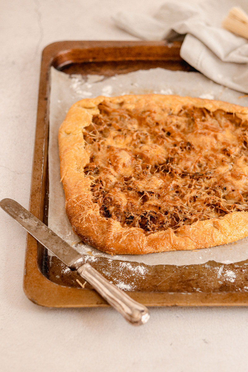 6.) Preheat the oven to 200ºC and line a large baking tray with baking paper. Dust your work surface with a little flour and roll the pastry out into a rough circle approximately 3mm thick. Combine the cheddar and gruyere cheese and sprinkle a third onto the pastry base. Top with the onion filling, leaving a 2-3cm border all around the edge.