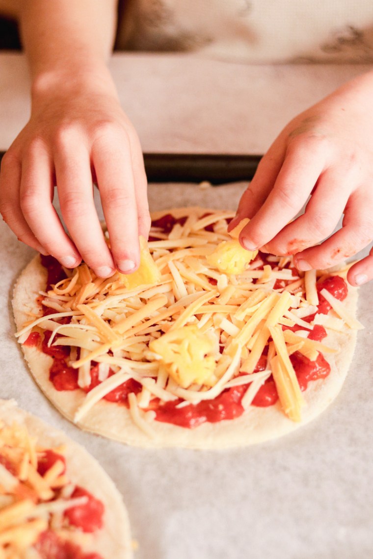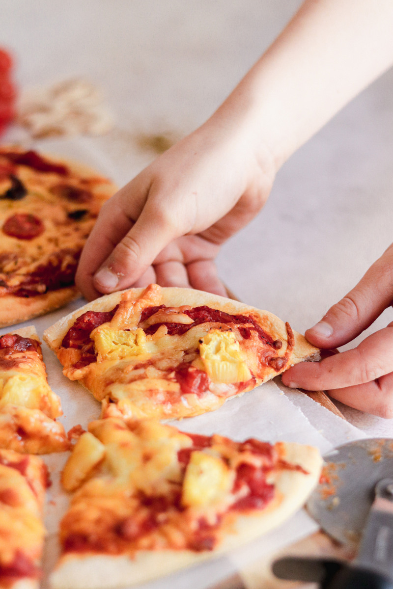 The beauty of these of course is that everyone can customise their own pizza. We usually make sure that everyone has their favourite included in the mix, then we slice it all up and share. Miss M. has her favourite salami and mushroom combo while young J simply has to have fresh pineapple chunks on his.