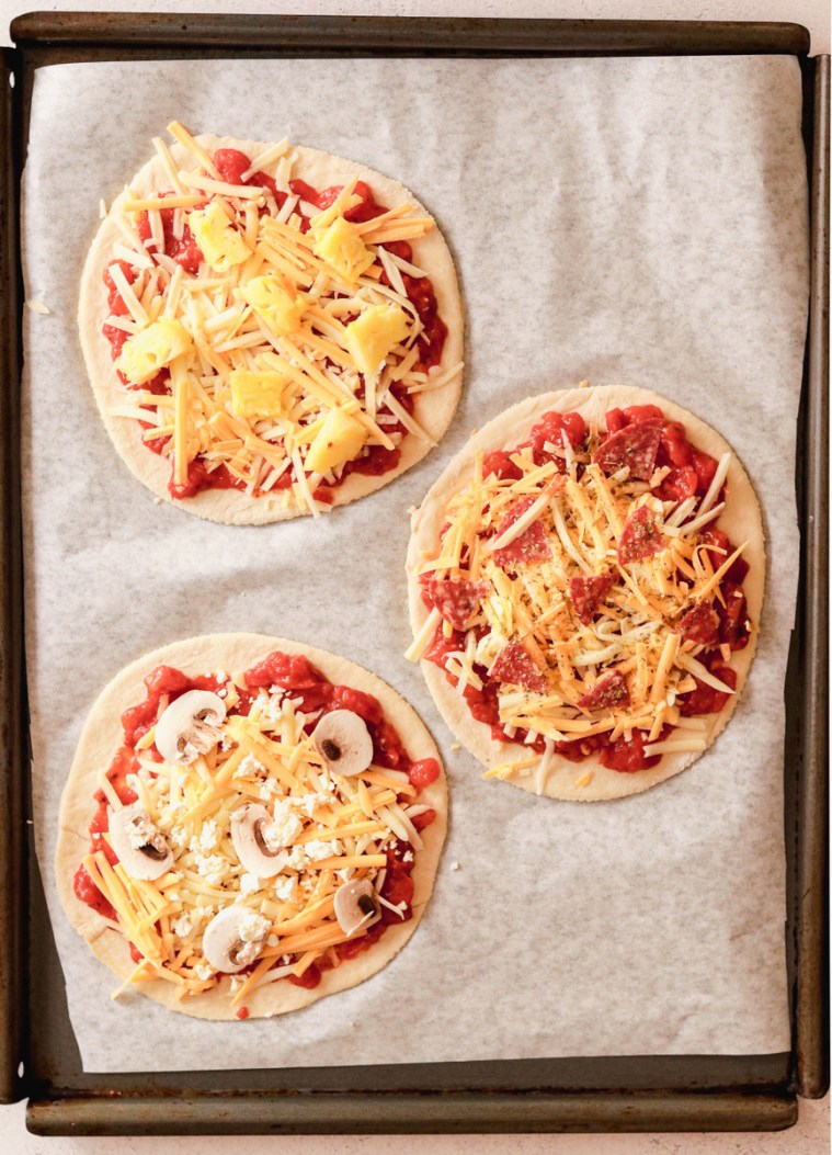 4.) Have your grated cheese and toppings set out and ready to use. Take the preheated baking trays out of the oven and grease lightly. Arrange the pizza bases on the trays and bake for 5 minutes. Remove from the oven and spread the pizza sauce over them. Add the grated cheeses, your favourite toppings and a sprinkling of mixed herbs.
