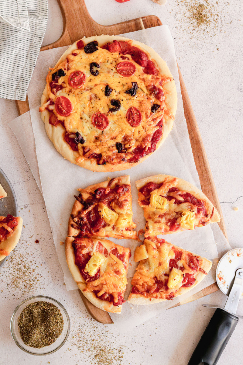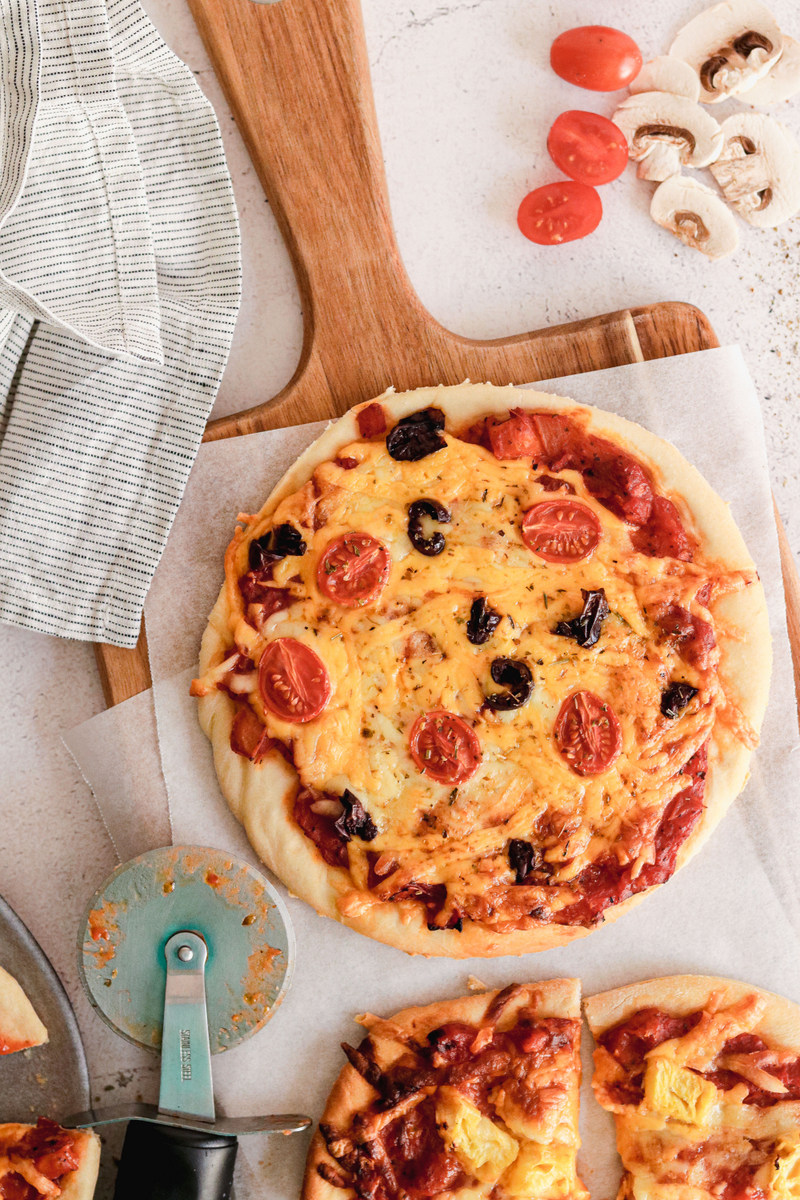 5.) Bake the pizzas for 10-15 minutes (keep an eye on them towards the end) until the bases are golden and cooked through and the cheese is bubbling. Slice and serve hot.