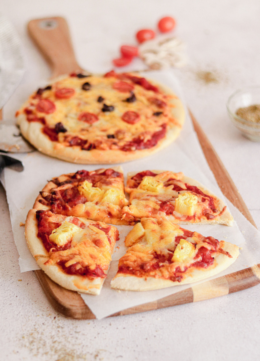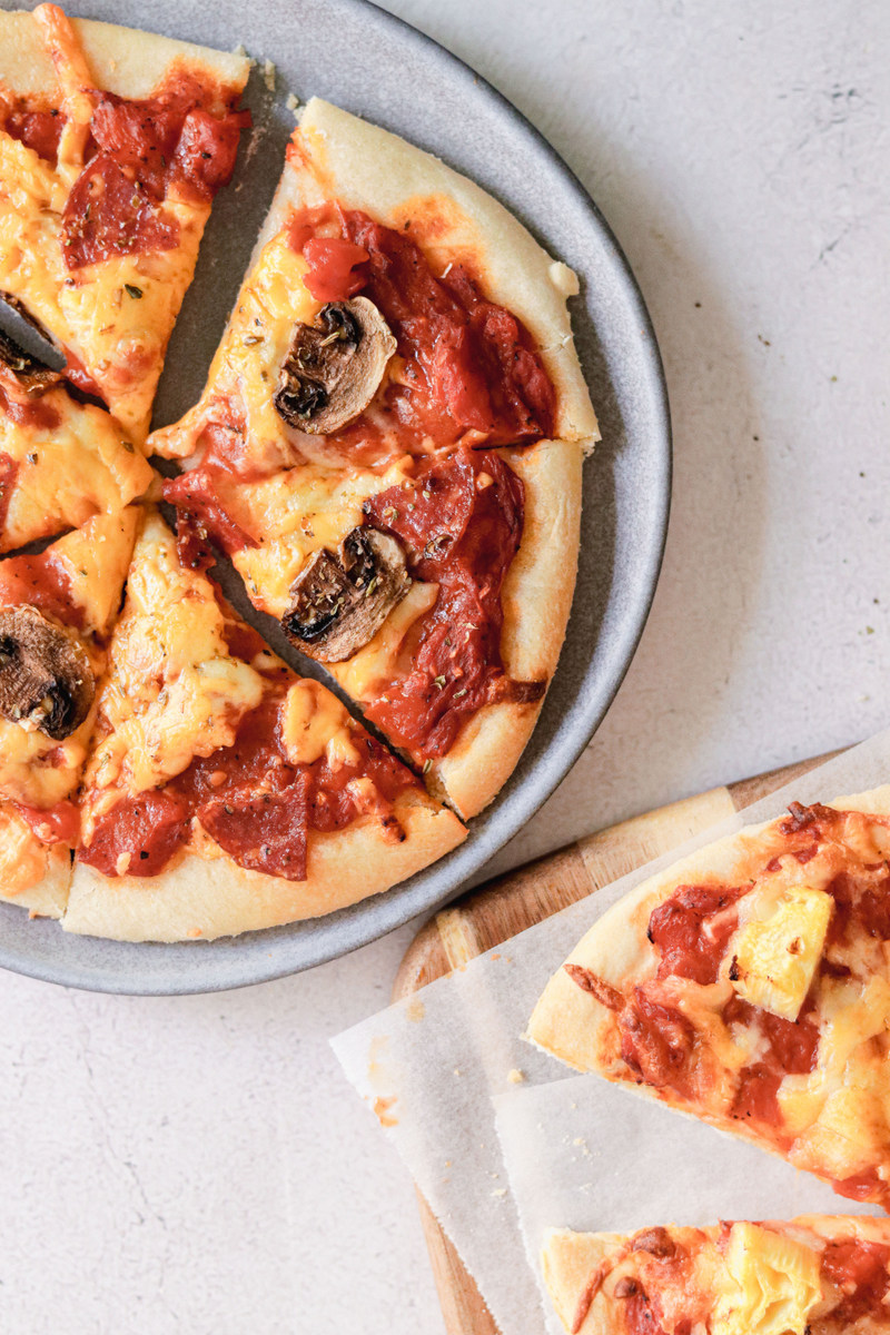 Ah, I see the weekend on the horizon! We love Fridays around here. The end of the work week, no homework to worry about and a chance to kick back and engage relaxation mode. Friday nights are often movie night around here, and this pizza is regularly requested by the kids. As tempting as it is to rather pick up the phone and order in (and don’t get me wrong, we do that too!) this pizza is worth making from scratch and actually doesn’t require too much effort in terms of hands on cooking. It’s super delicious – perfect movie night food!