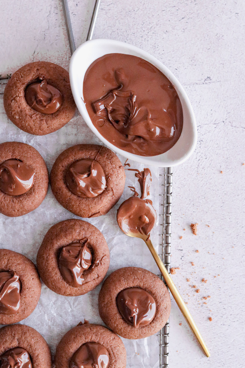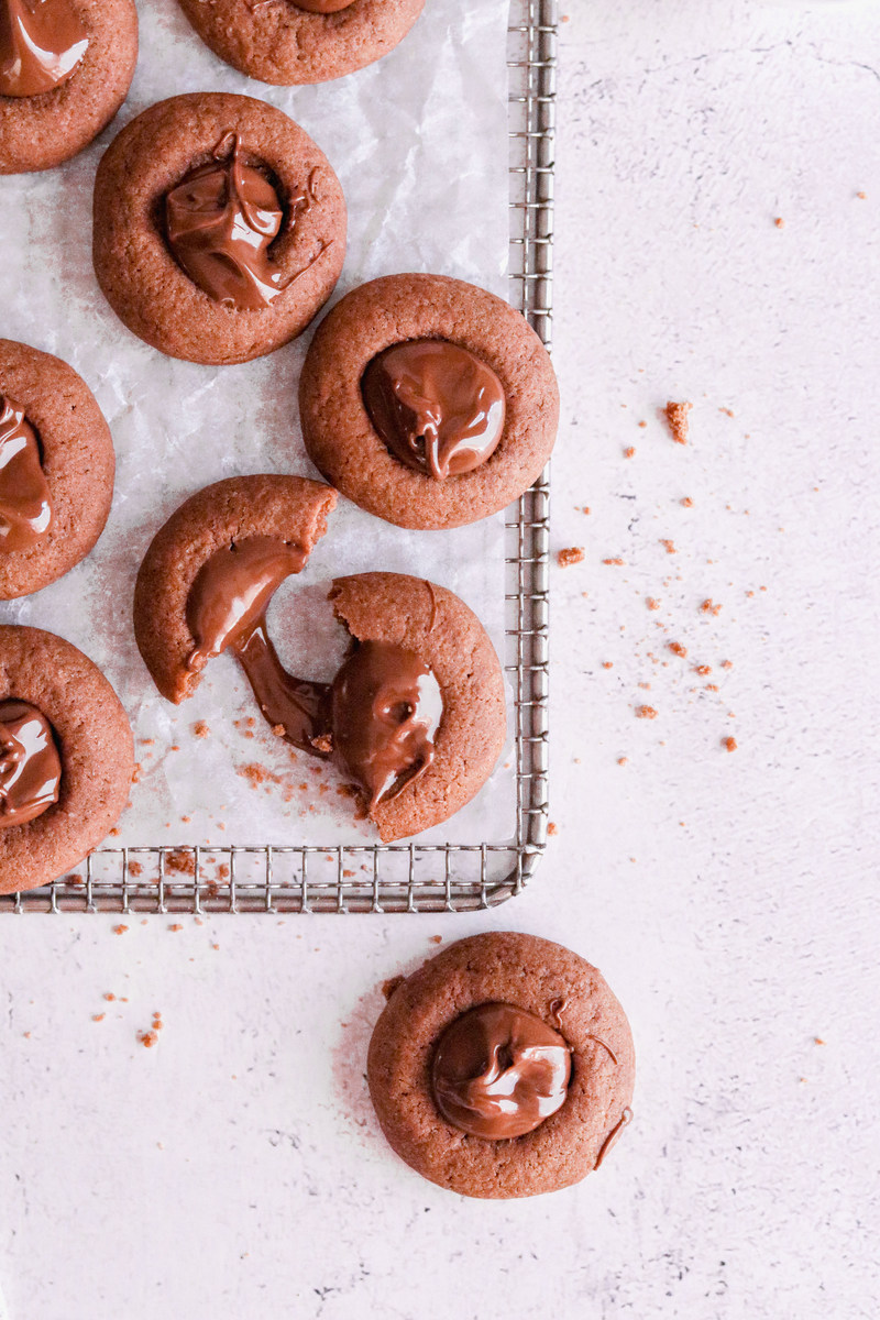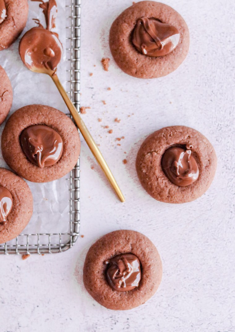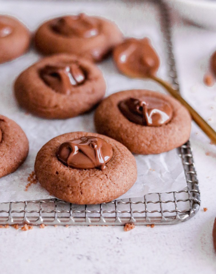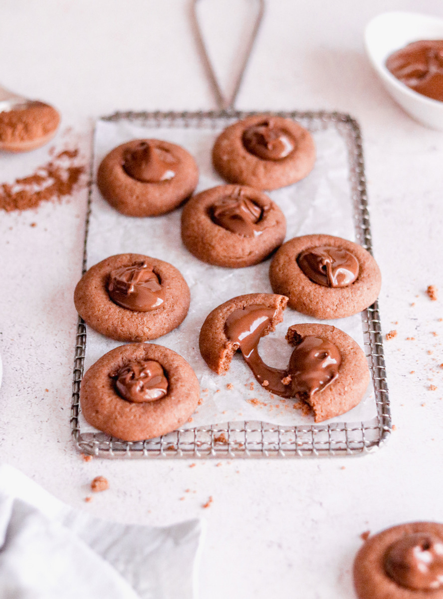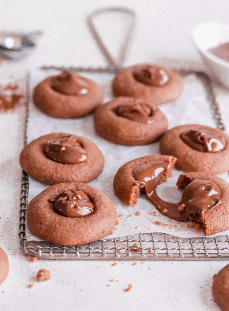 What happens when you take a family childhood cookie recipe and give it a Nutella update? Chocolatey magic, that’s what! Thumb cookies are such a nostalgic bake for me, usually flavoured with almond essence and filled with sticky apricot or strawberry jam. We made and enjoyed them often as kids, and when I taught my own children how to make them they loved them too. Such fun to make!