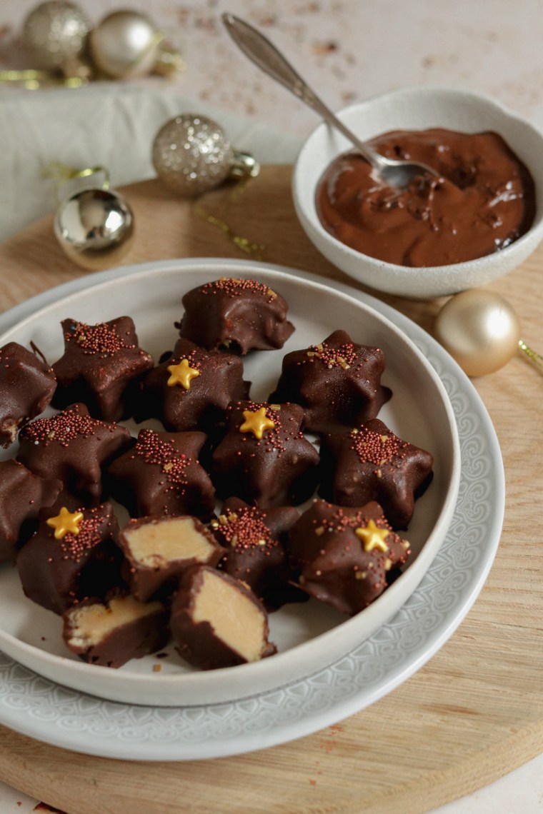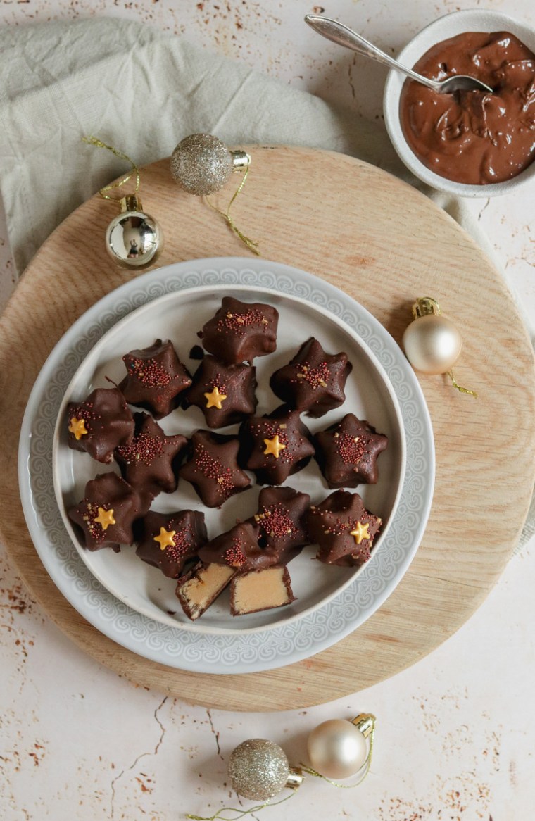 4.) Remove half of the stars from the freezer and dip in the dark chocolate. Drain any excess chocolate and transfer to another piece of baking paper. Decorate with sprinkles and glitter and leave to set. Dip the remaining stars and decorate. Store in a cool place.