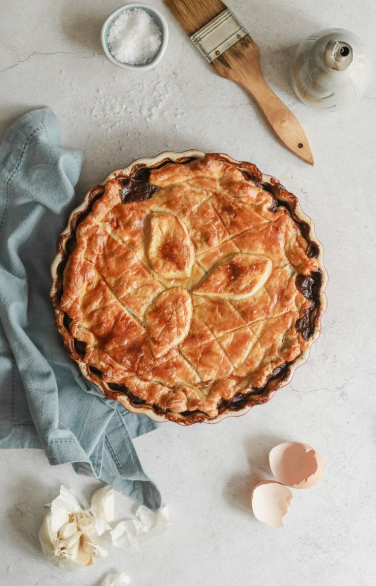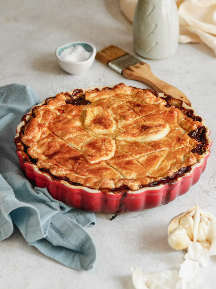 7.) Unroll the puff pastry and cut out a lid a few centimetres larger than the pie dish you’re using. Carefully pop the lid on top of the filling and either tuck the edges in or pleat them. If you have any pastry scraps you can use these to decorate the pie.