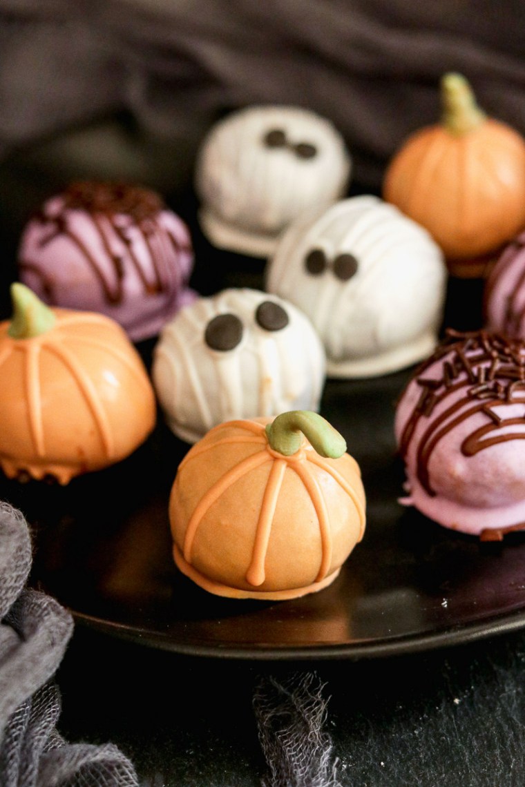 - Ghosts – dip the truffles in white chocolate. Allow to set, then drizzle with extra white chocolate and attach small black fondant eyes.
