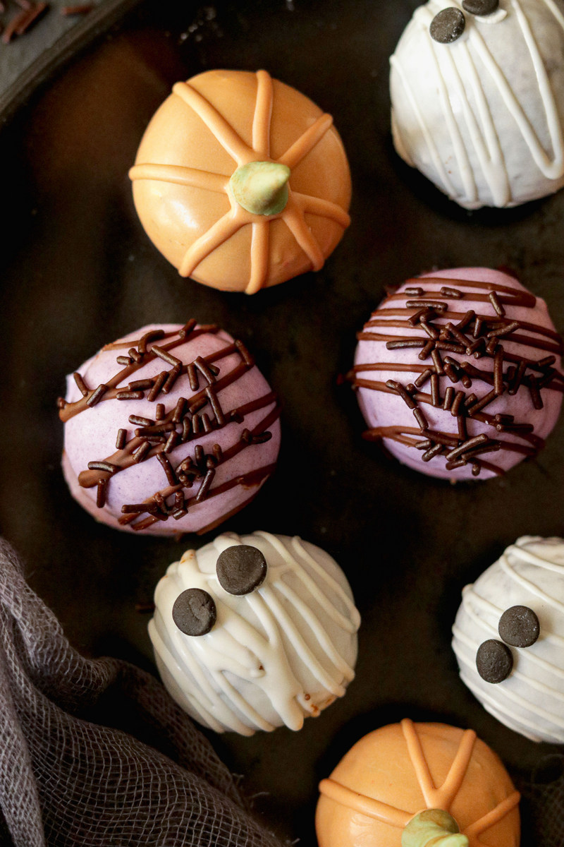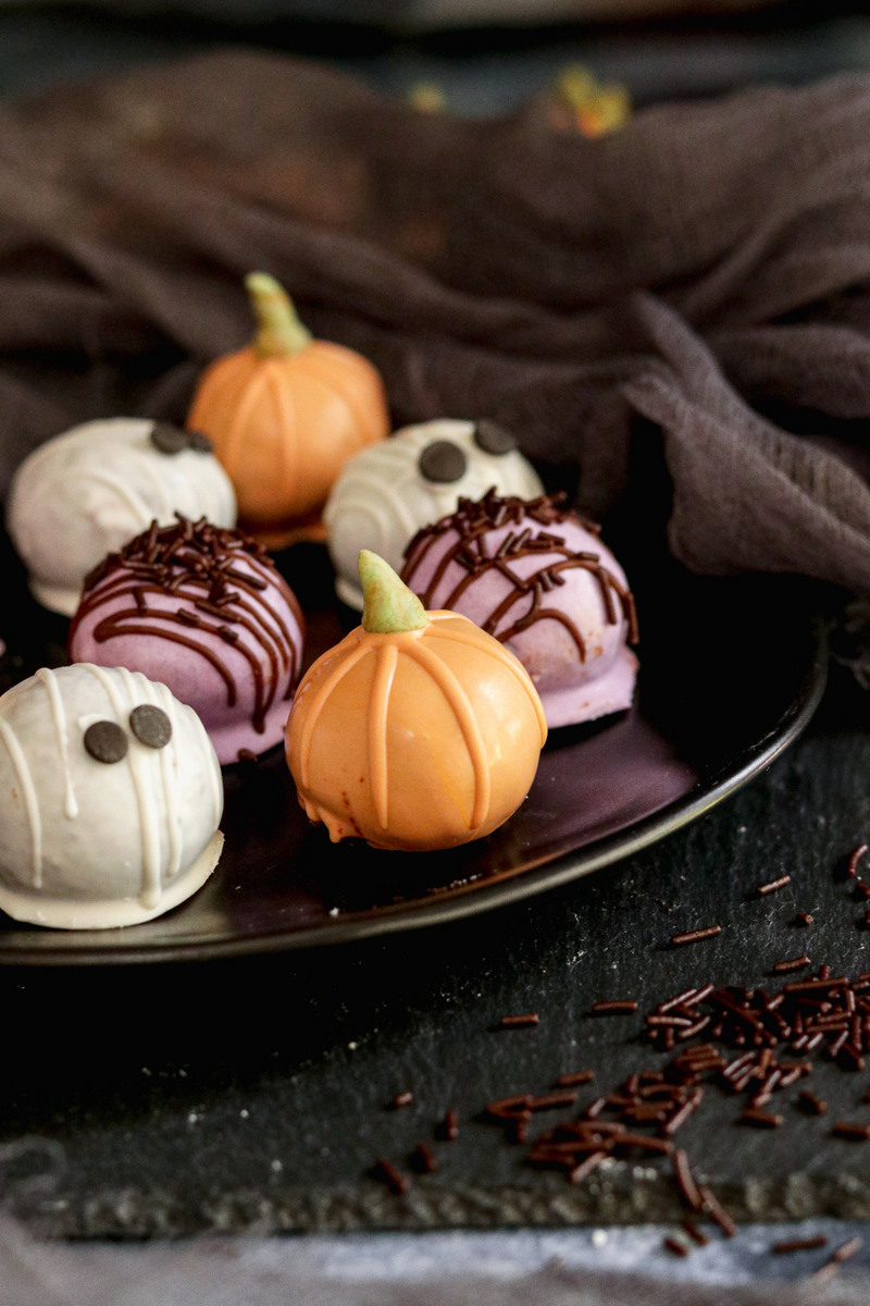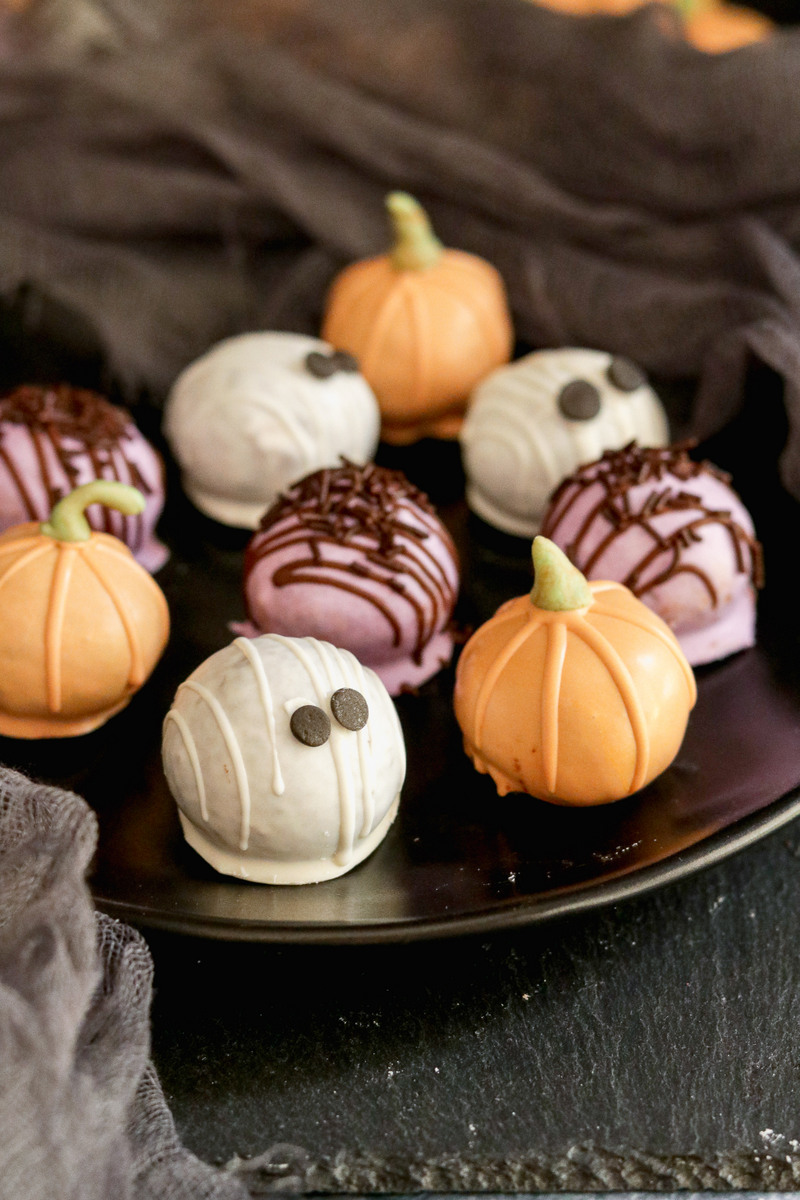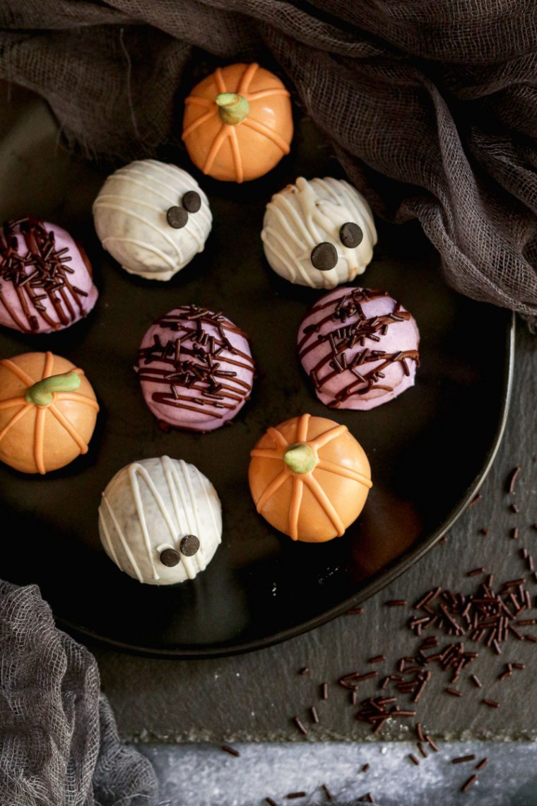 For the decoration I opted for ghosts (the drizzle makes them look a little like mummies!), pumpkins and purple truffles. You can really go wild here and make all sorts of ghouls and monsters. Here’s how I put my Halloween biscuit truffles together: