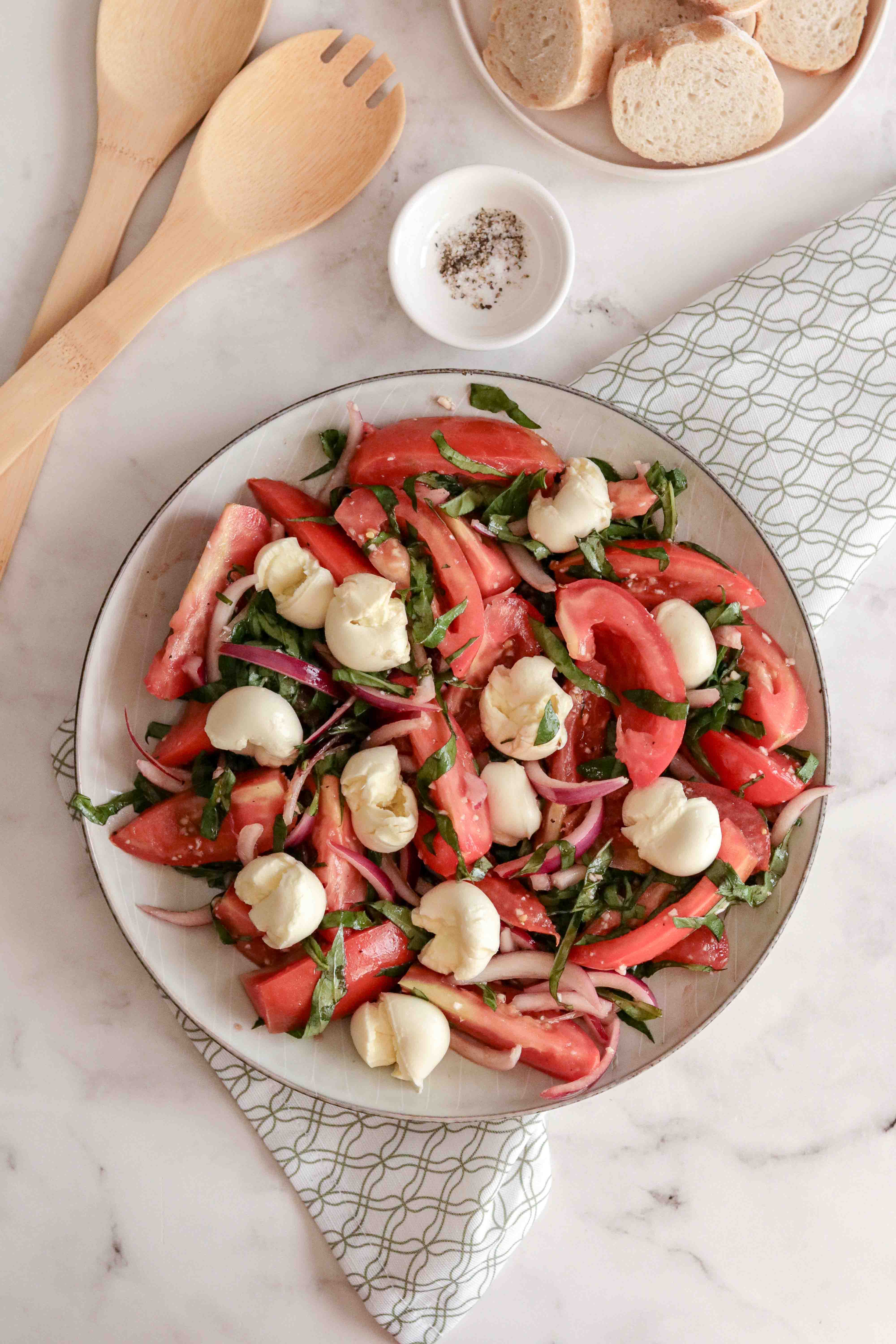 This is my favourite type of recipe – simple, fresh ingredients where the flavours truly shine! This light and refreshing tomato and mozzarella summer salad makes a beautiful side dish or a light meal, perfect for those hot days when you don’t feel like spending too much time in the kitchen.