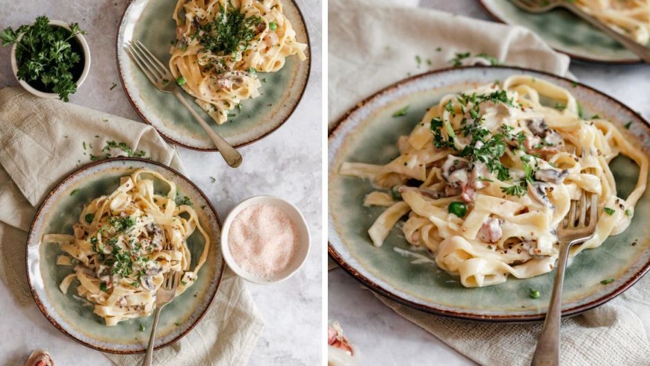 I love a bowl of creamy pasta and the unseasonably cooler weather we’ve been having this week has me craving meals like this, they’re just so comforting. This is another great recipe to keep handy for weeknight suppers as it’s quick to prepare and the whole family will love it.
