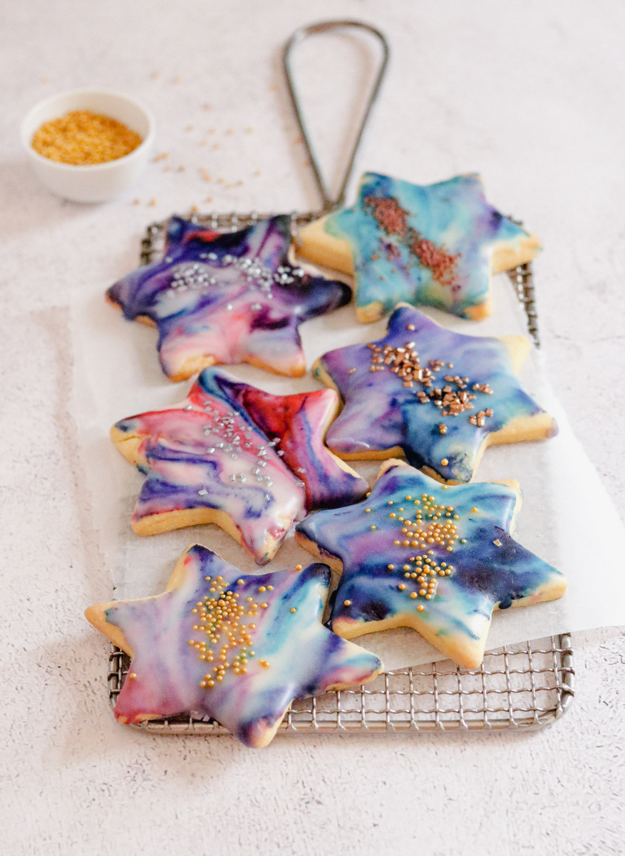 Last year I was asked to make two hundred individually wrapped star cookies for a school fundraiser and I only realised recently that I haven’t yet shared the recipe! It’s a very easy sugar cookie recipe, but the really fun part is decorating the baked cookies with marbled icing and sprinkles to make cute and unique tea time treats that are sure to delight!