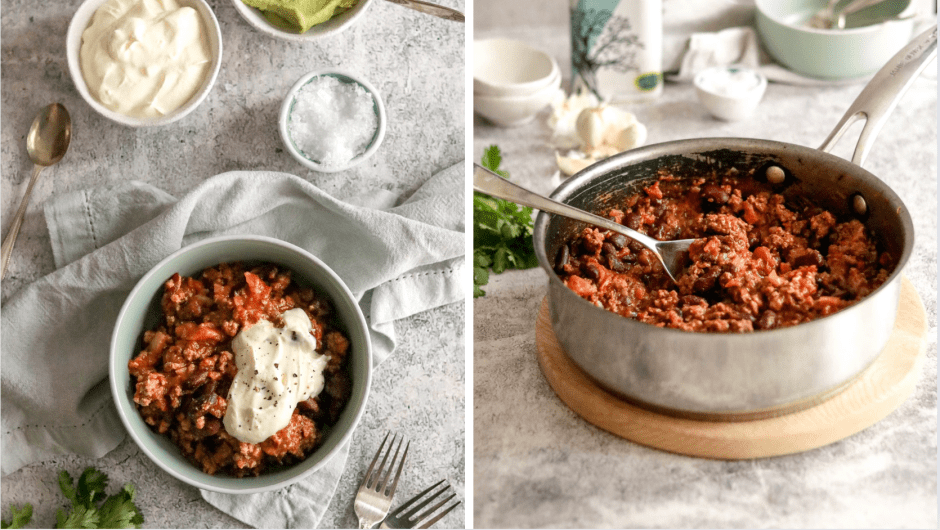 This basic beef chilli recipe is so satisfying and will warm you up from the inside out on cold winter evenings. We love a good old spag bol at home, and beef chilli is a bit like spag bol’s spicy cousin. With beans. Pop the pot onto the table along with your side dishes, and let everyone help themselves and build their own meal. This is one recipe where I know I’m guaranteed to see clean plates at the end of dinner time!